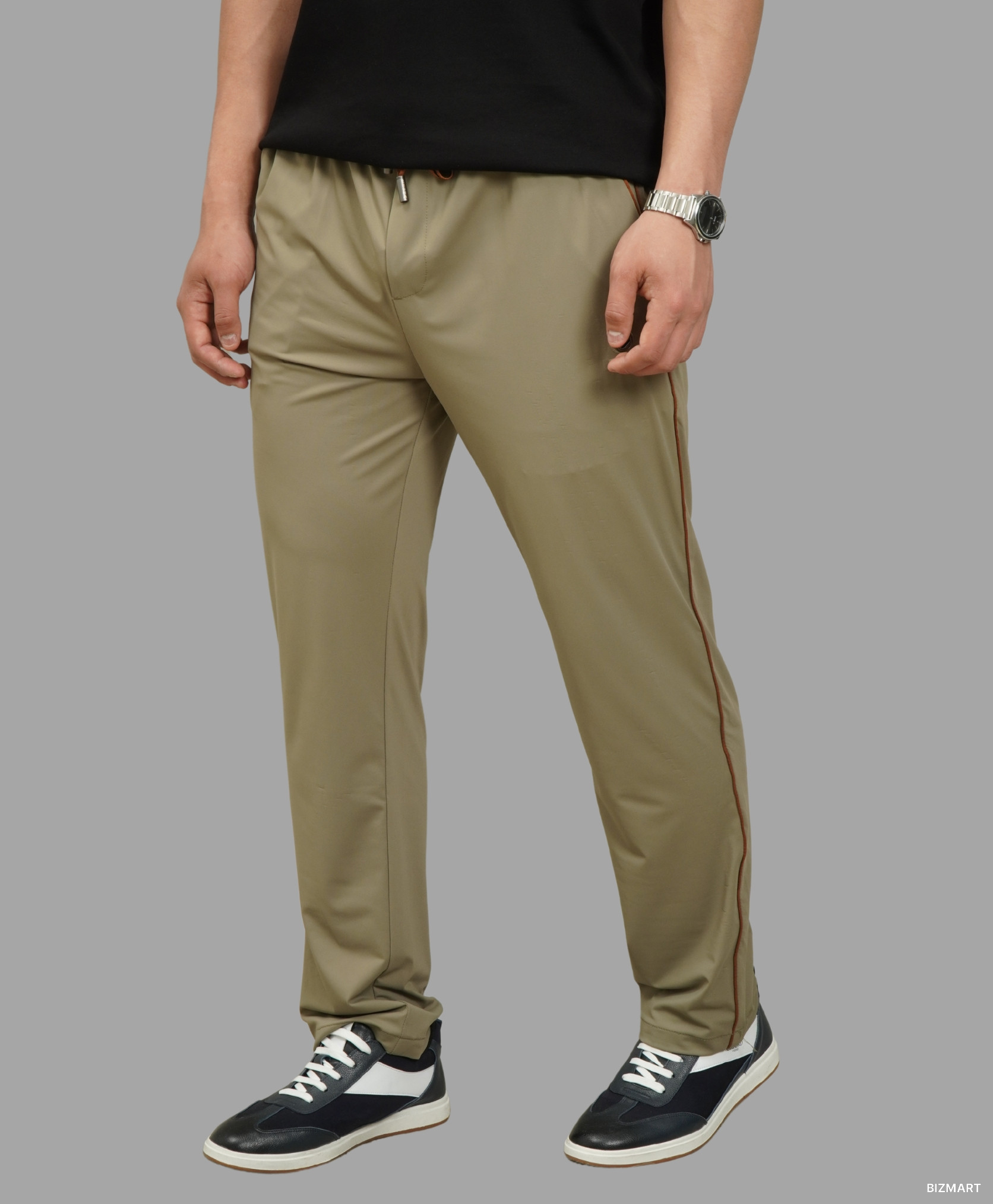 Мужские бежевые спортивные брюки из лёгкого, гладкого материала с лёгким блеском. Свободный крой обеспечивает комфорт, эластичный пояс со шнурком позволяет регулировать посадку. Боковая контрастная полоска придаёт образу спортивный акцент. Подходят для прогулок, отдыха и повседневной носки.