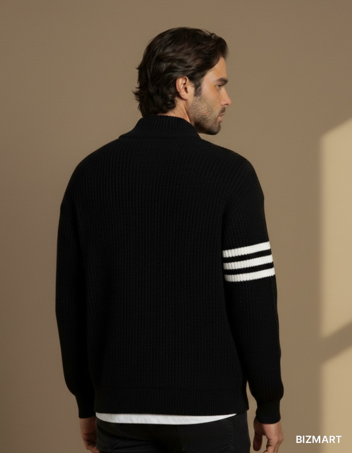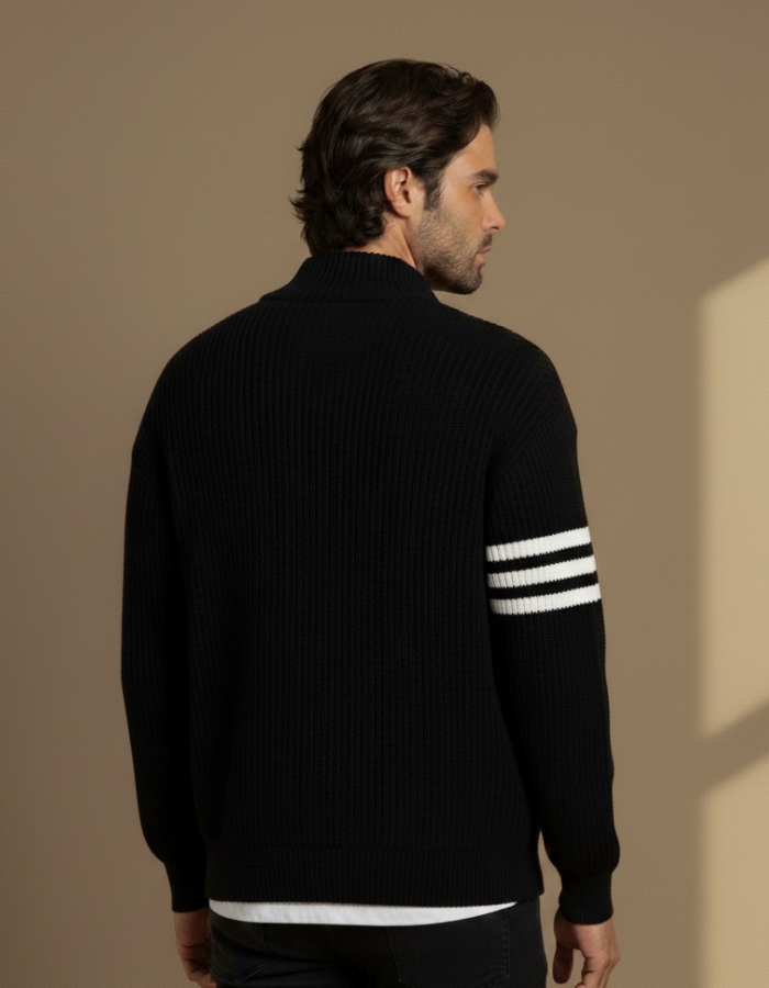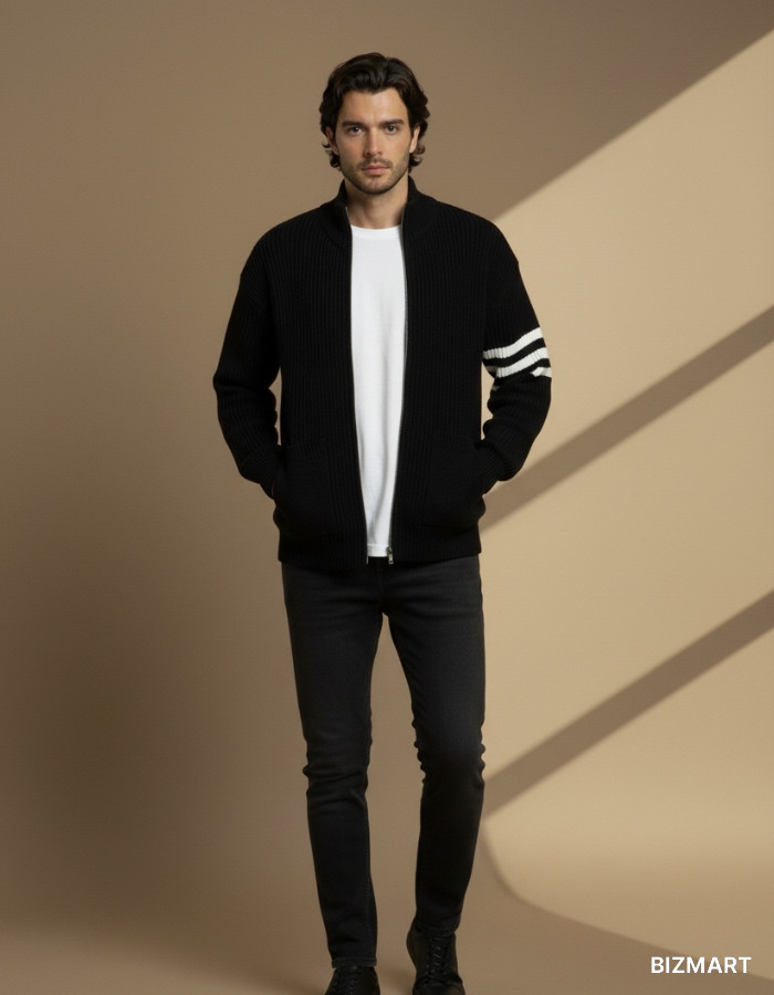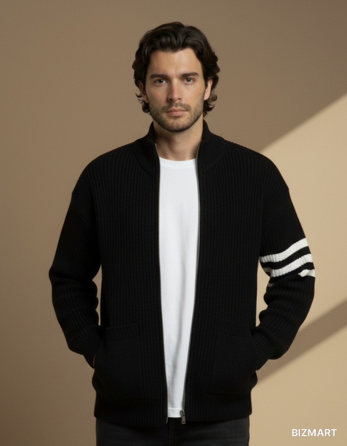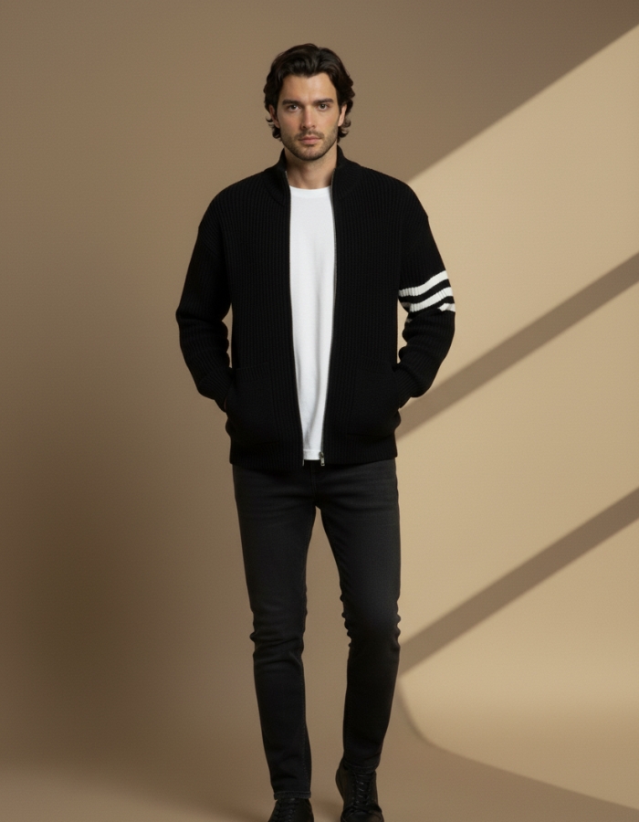 Удобный и стильный мужской кардиган из плотного трикотажа. Модель оснащена застёжкой-молнией и высоким воротником для защиты от холода. Контрастные белые полосы на рукаве придают изделию современный и динамичный вид. Два накладных кармана добавляют практичности.