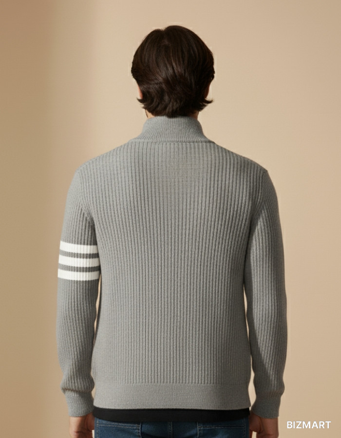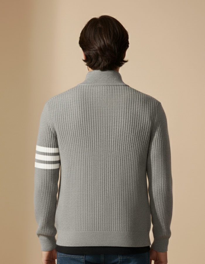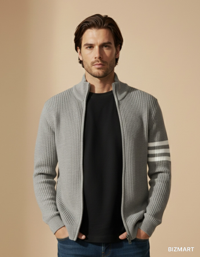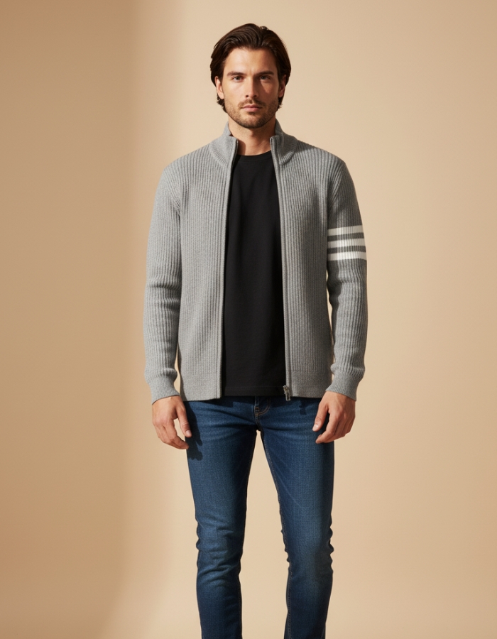 Современный и стильный мужской кардиган из мягкого трикотажа. Выполнен в универсальном сером цвете с контрастными белыми полосами на рукаве, которые добавляют образу спортивной динамики и оригинальности. Высокий воротник и застёжка-молния обеспечивают комфорт и защиту от холода.