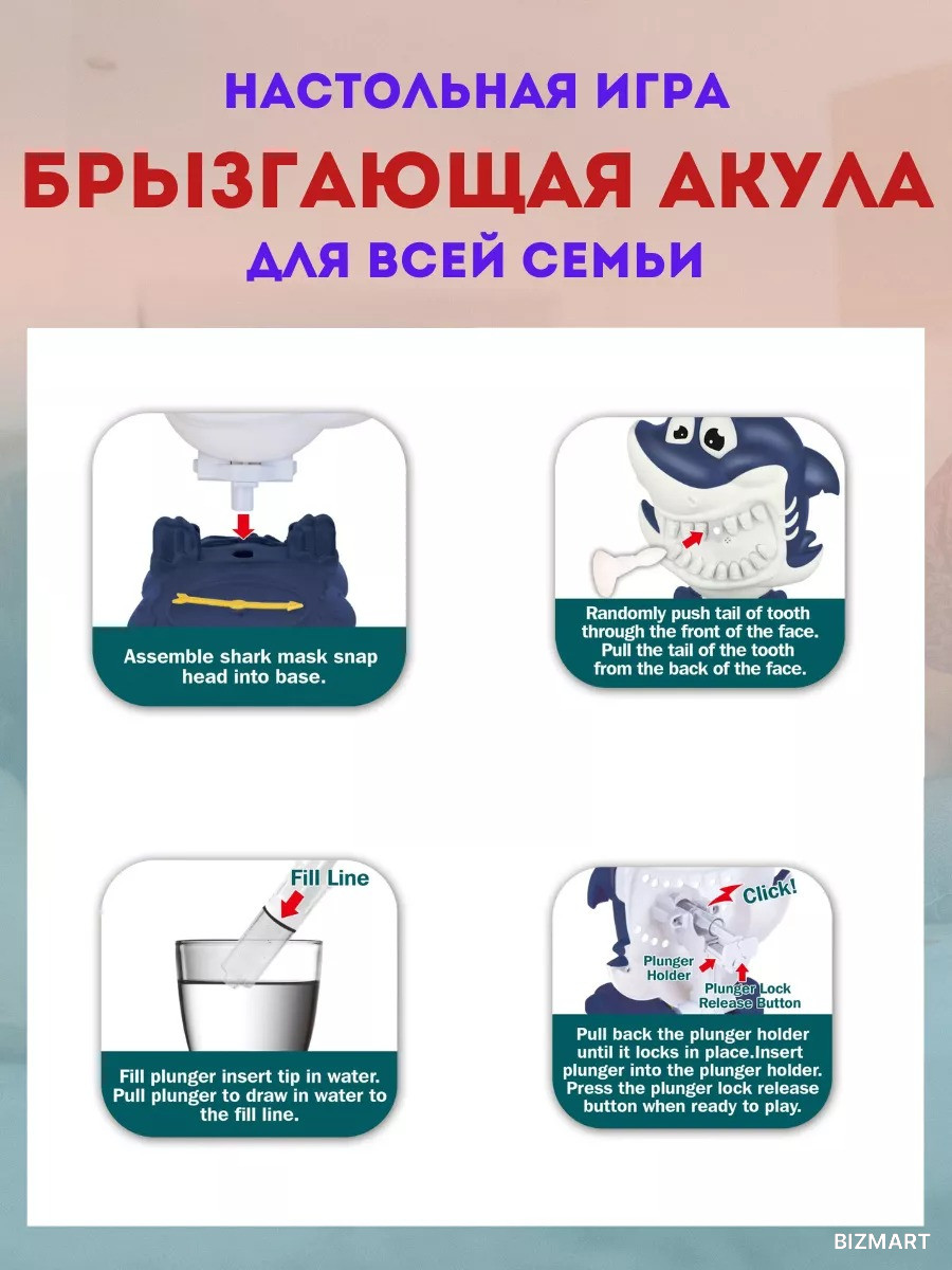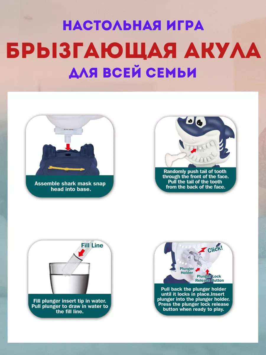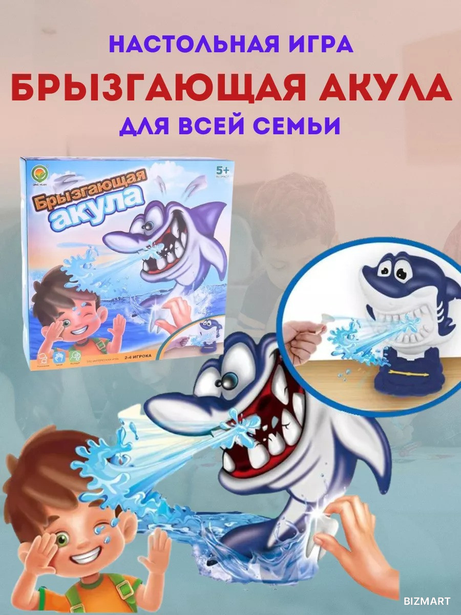 Настольная игра «Брызгающая акула» — это весёлая и динамичная игра для компании до 4 человек, которая подарит море эмоций детям и взрослым. Игрокам предстоит по очереди доставать зубы из пасти акулы, стараясь быть максимально аккуратными — ведь в любой момент акула может выпустить струю воды.