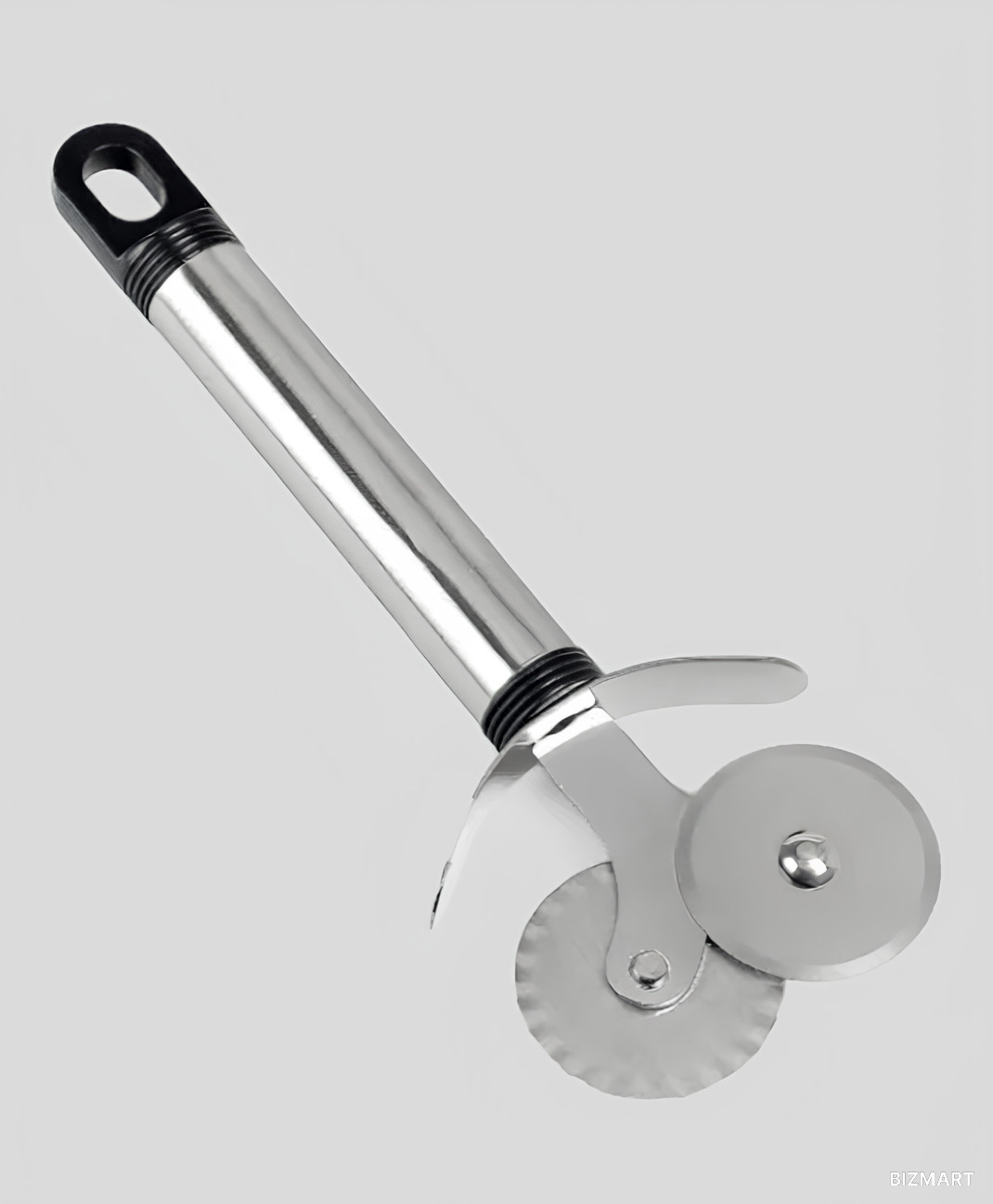 Нож двойной из нержавеющей стали 2 в 1 соединяющий в себе нож для пиццы и фигурный нож для теста, выбирая вариант использования можно резать под углом либо пиццу, либо тесто, очень удобный и полезный гаджет станет не заменимым помощником хозяйке. Этот нож поможет вам быстро и аккуратно нарезать пиццу на кусочки.