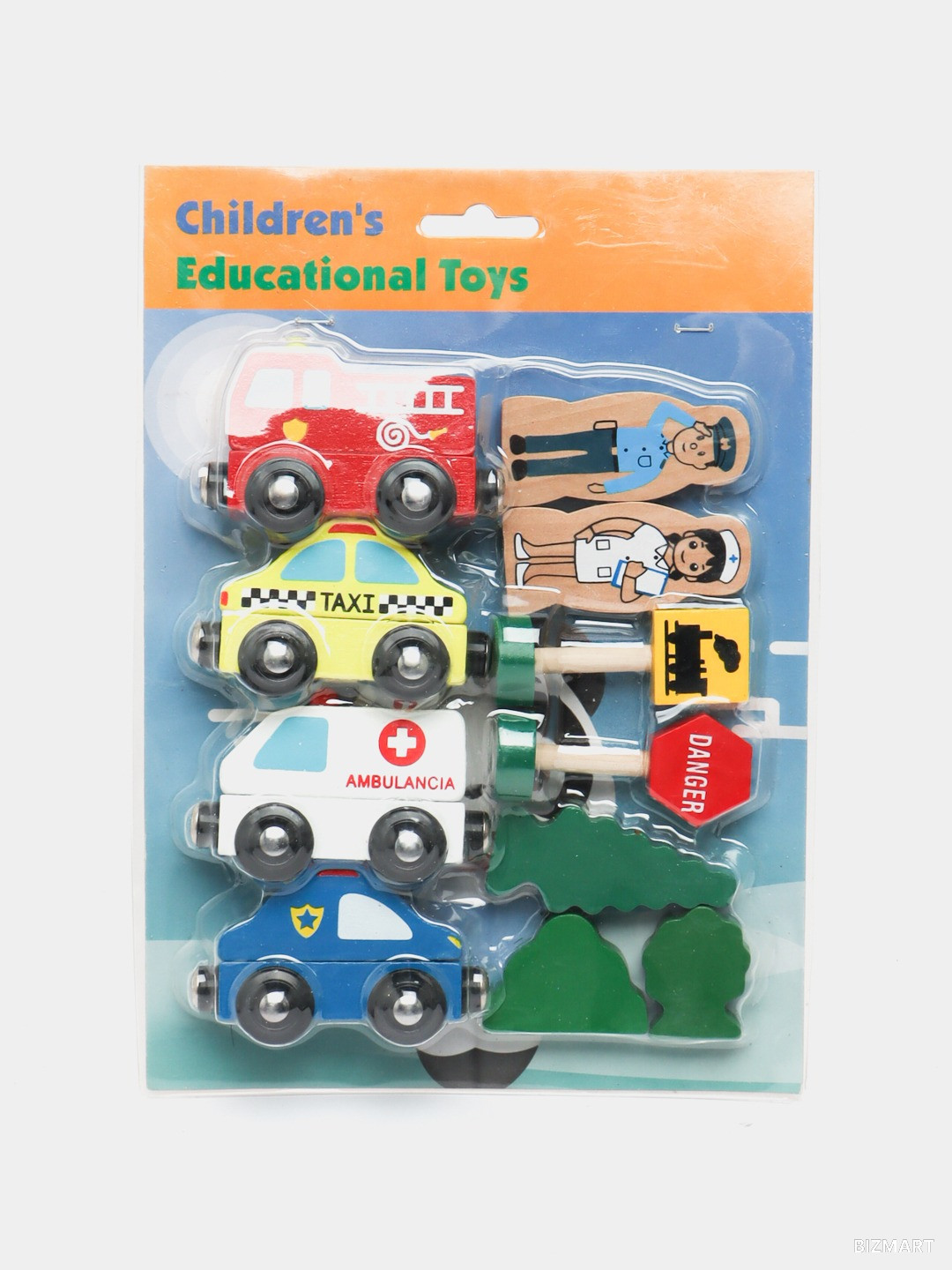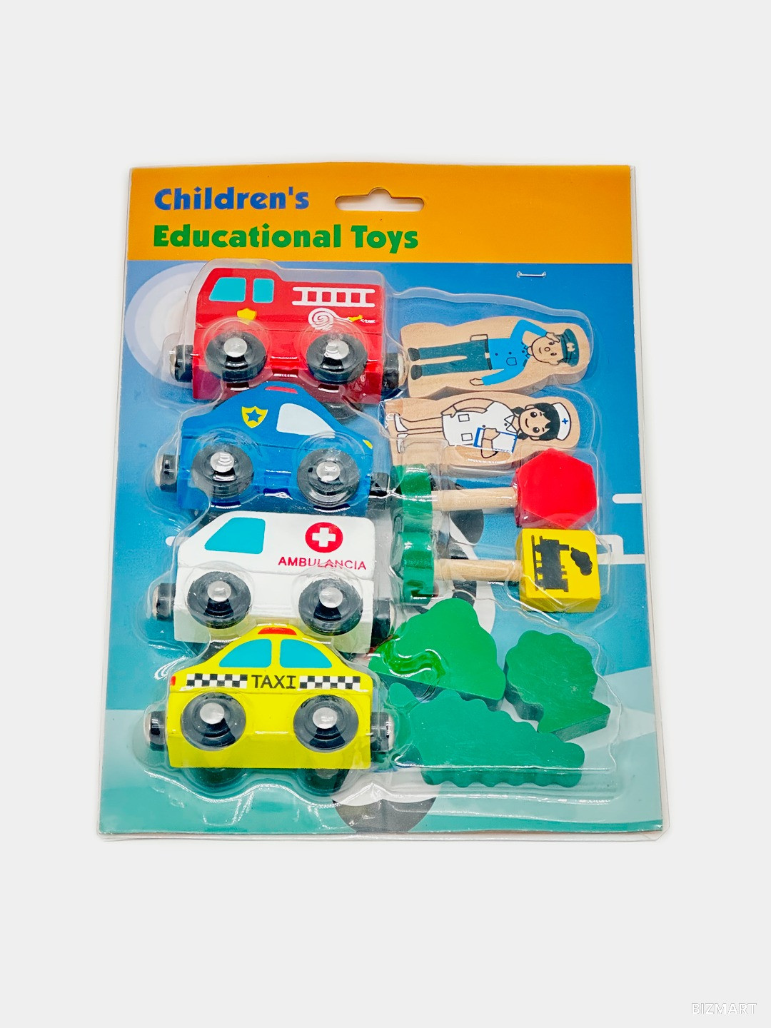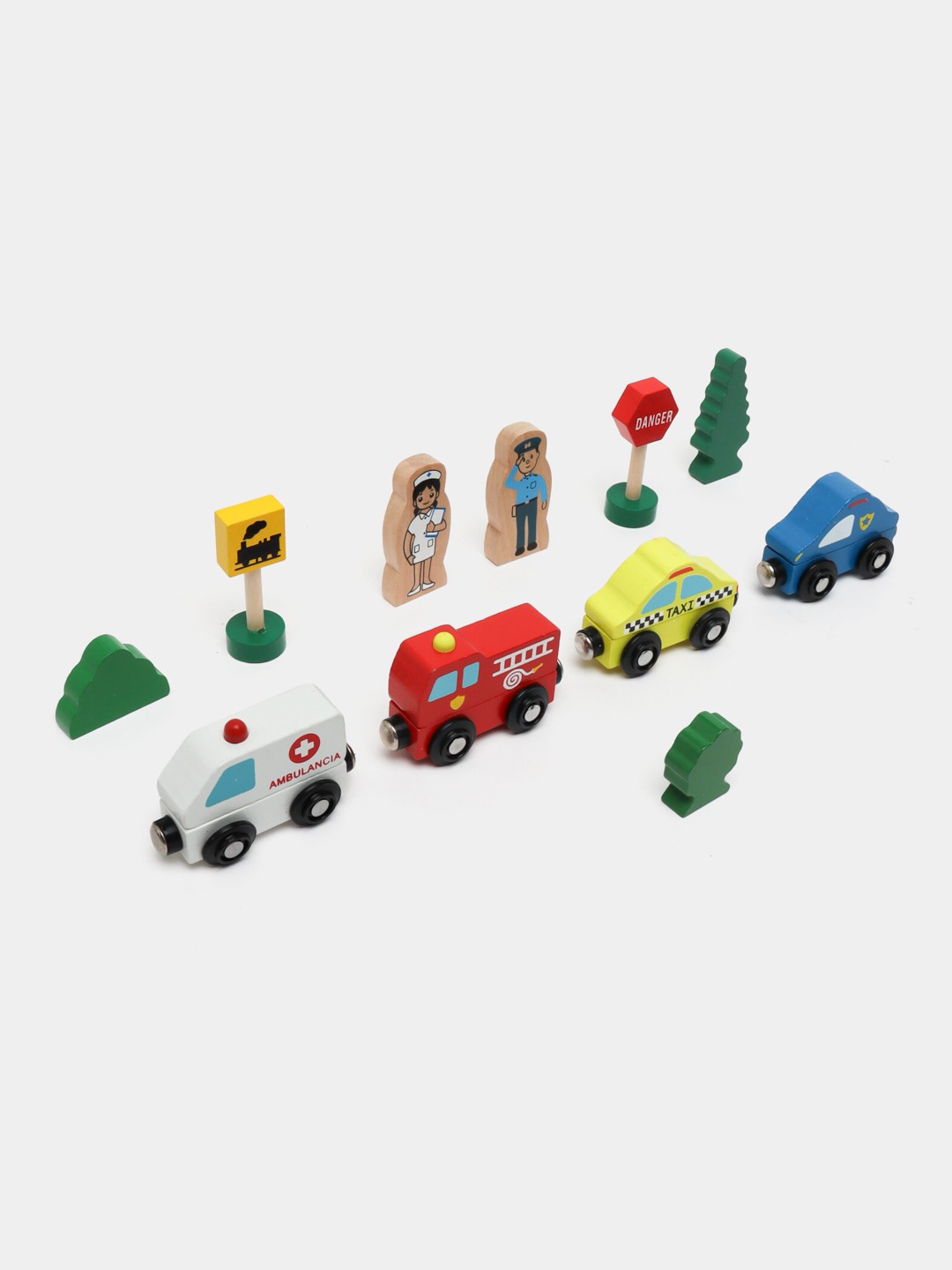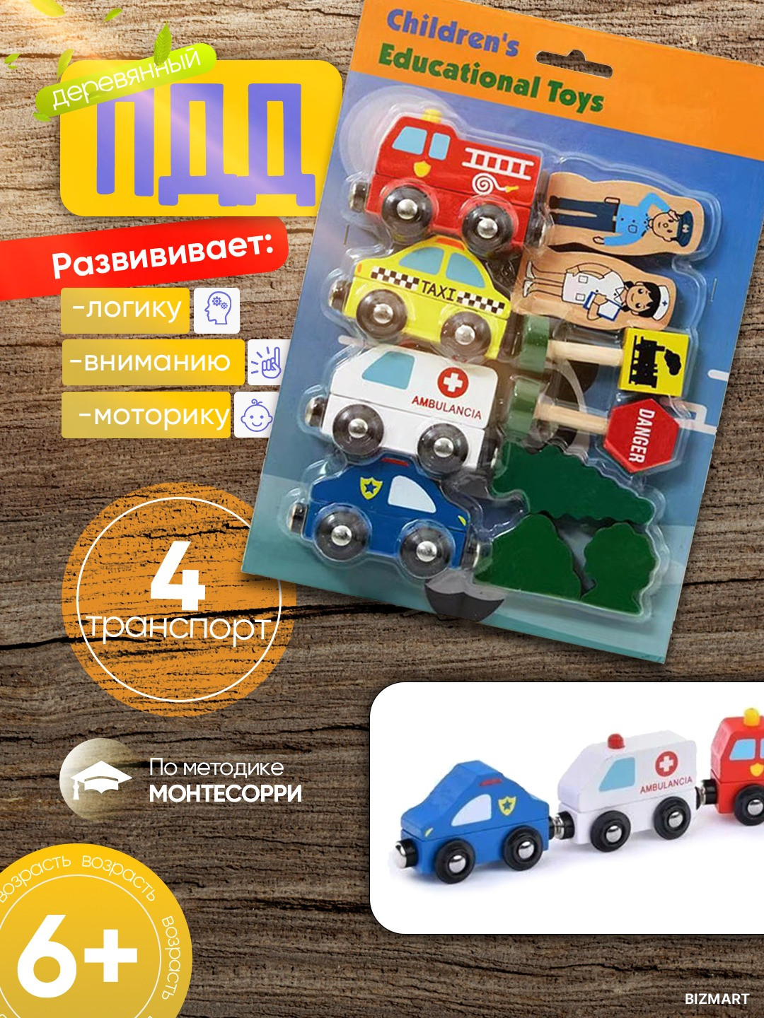 Развивающий деревянный набор с транспортом и персонажами для детей от 3 лет. Помогает изучать профессии, правила безопасности и развивать ролевые навыки в процессе игры.