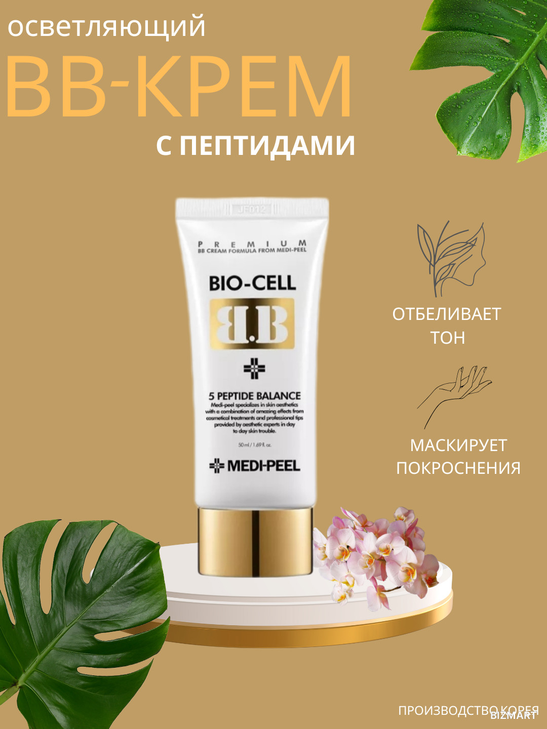 * Пептидный осветляющий BB-крем Medi-Peel 5 Peptide Balance Bio-Cell BB Cream – отличный продукт для тех, кто хочет добиться гладкого лица и позаботиться о молодой и здоровой коже. Средство не только маскирует покраснения, воспаления и расширенные поры, но и осветляет тон. Продукт обогащен 5 пептидными комплексами, которые борются с преждевременным старением, увеличивая выработку собственного коллагена и эластина для эластичности и плотности. Средство прекрасно скрывает недостатки, комфортно ощущается на коже и не утяжеляет ее, держится до 5 часов и не смывается после воздействия воды и пота. ВВ-крем бережно воздействует даже на чувствительную кожу, укрепляет барьерные функции.