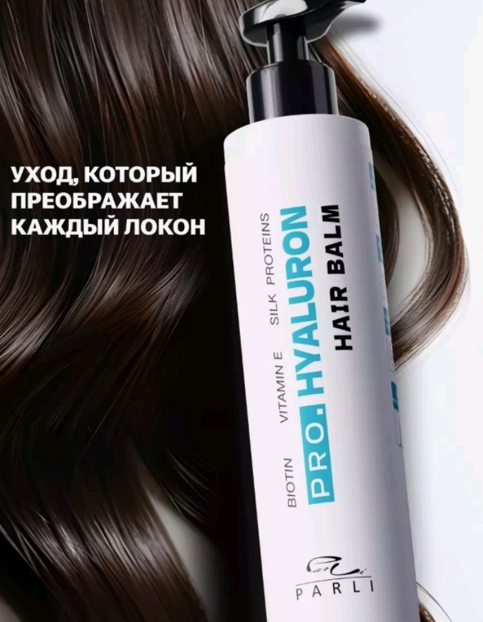 Увлажняющий бальзам для тонких и обезвоженных волос Pro.Hyaluron Parli Cosmetics облегчает расчесывание, интенсивно увлажняет волосы, делает их блестящими, объемными и упругими без утяжеления. Волосы выглядят более объемными после совместного применения с шампунем Pro.Hyaluron Parli Cosmetics. Активные компоненты: • гиалурон - как своеобразный водный резервуар, она наполняет волосы влагой, делая их плотными и упругими; • биотин – восстанавливает структуру волос по длине; • витамин Е – питает и восстанавливает волосы; • протеины шелка – придают волосам блеск и гладкость.