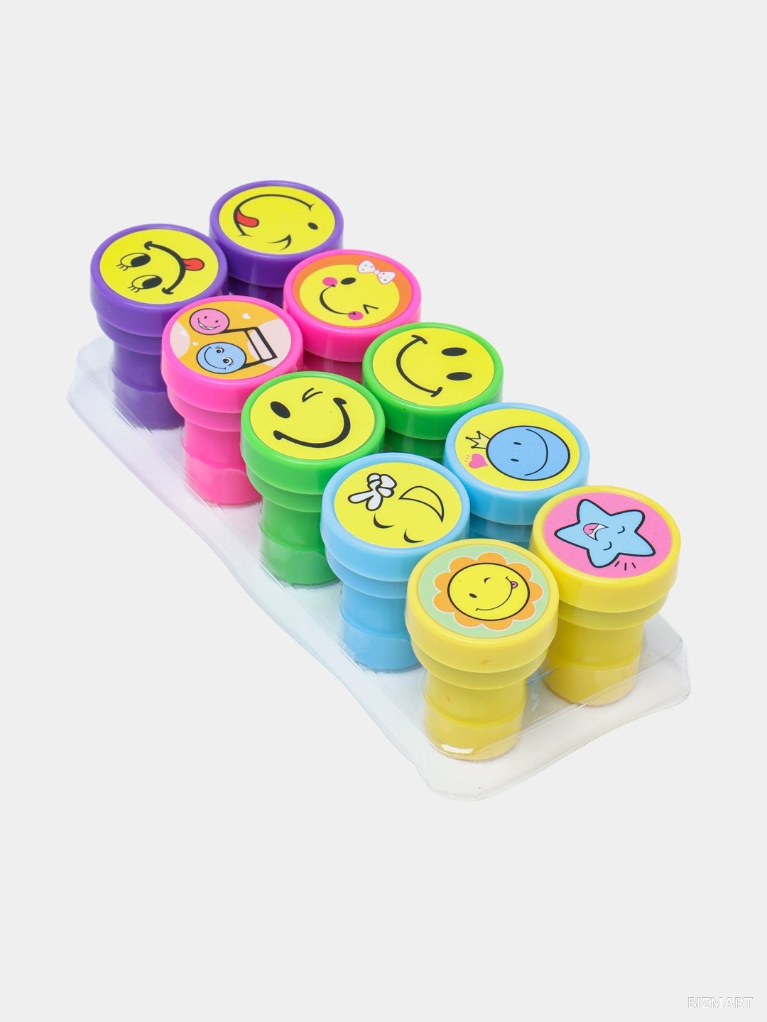 🌈 12 ярких штампов — в наборе разные изображения: смайлики, звёздочки, солнышки и милые мордашки. Улыбка на каждом оттиске!