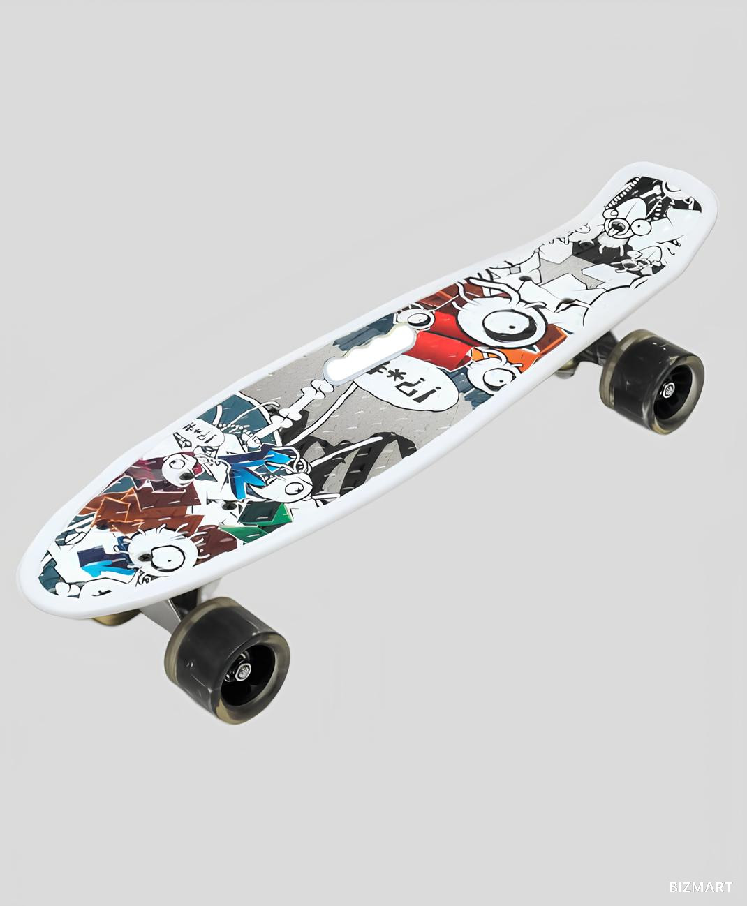 Размер доски: 55х14см. Принт Граффити - монстры. Скейтборд подойдёт детям и подросткам для прогулок в парке и круизинга по городу. Прочная пластиковая доска усилена ребрами жесткости. Рифлёная поверхность скейтборда обеспечивает хорошее сцепление с обувью. Алюминиевая подвеска с бушингами средней жесткости. Оснащен мягкими полиуретановыми, светящимися колесами и ручкой для переноса.