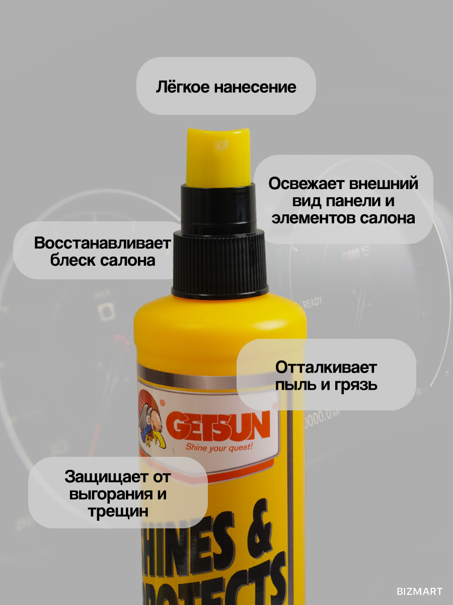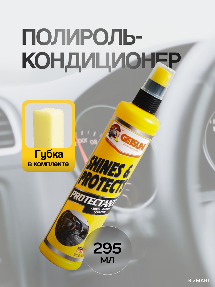Полироль-кондиционер GETSUN Protectant эффективно обновляет внешний вид салонных поверхностей, возвращая им натуральный блеск и яркость. Формирует защитный слой, который предотвращает выгорание, растрескивание и пересыхание пластика, резины и винила. Средство отталкивает пыль и облегчает последующую уборку, делая поверхность более стойкой к ежедневным загрязнениям. Удобный формат спрея обеспечивает ровное и лёгкое нанесение без разводов. Подходит для обработки торпеды, дверных карт, панелей и других элементов интерьера. Объём: 296 мл.