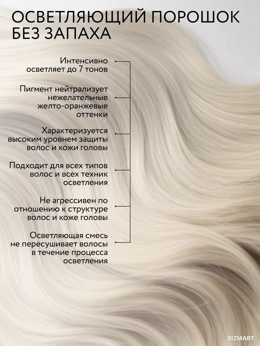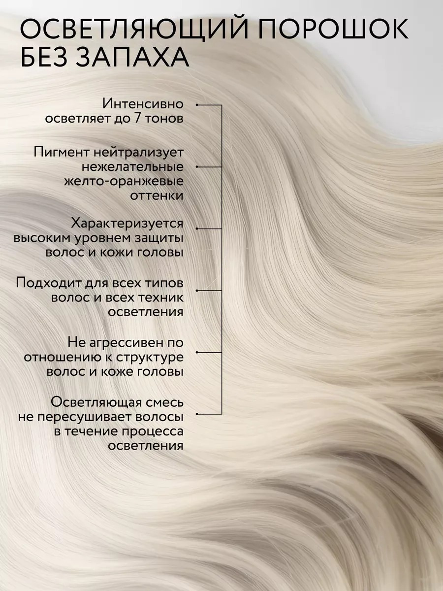 Профессиональный осветляющий порошок для волос. Обеспечивает осветление до 7 уровней тона. Подходит для всех техник обесцвечивания: мелирования, блондирования, осветления корней. Содержит фиолетово-голубой пигмент для нейтрализации жёлтых и оранжевых оттенков. Обеспечивает равномерное нанесение и контролируемый процесс осветления без пересушивания.