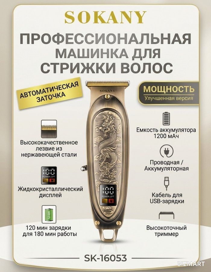 SOKANY SK-16053 — это эксклюзивная модель в коллекции профессиональных инструментов для груминга. Сочетая в себе роскошный бронзовый корпус с глубокой гравировкой дракона и передовые технологии бритья, этот триммер станет не только вашим главным помощником в создании стиля, но и настоящим украшением интерьера.