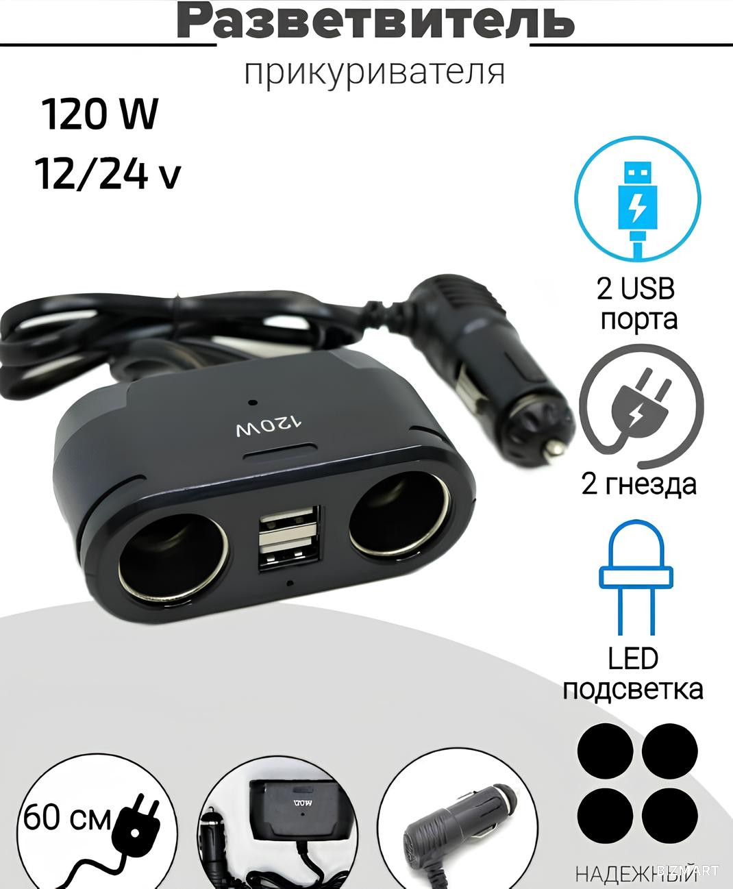 Разветвитель прикуривателя IN-CAR предназначен для подключения нескольких устройств к автомобильному прикуривателю. Он имеет два гнезда для прикуривателя и два порта USB, что позволяет заряжать мобильные устройства, планшеты, навигаторы и другие гаджеты.