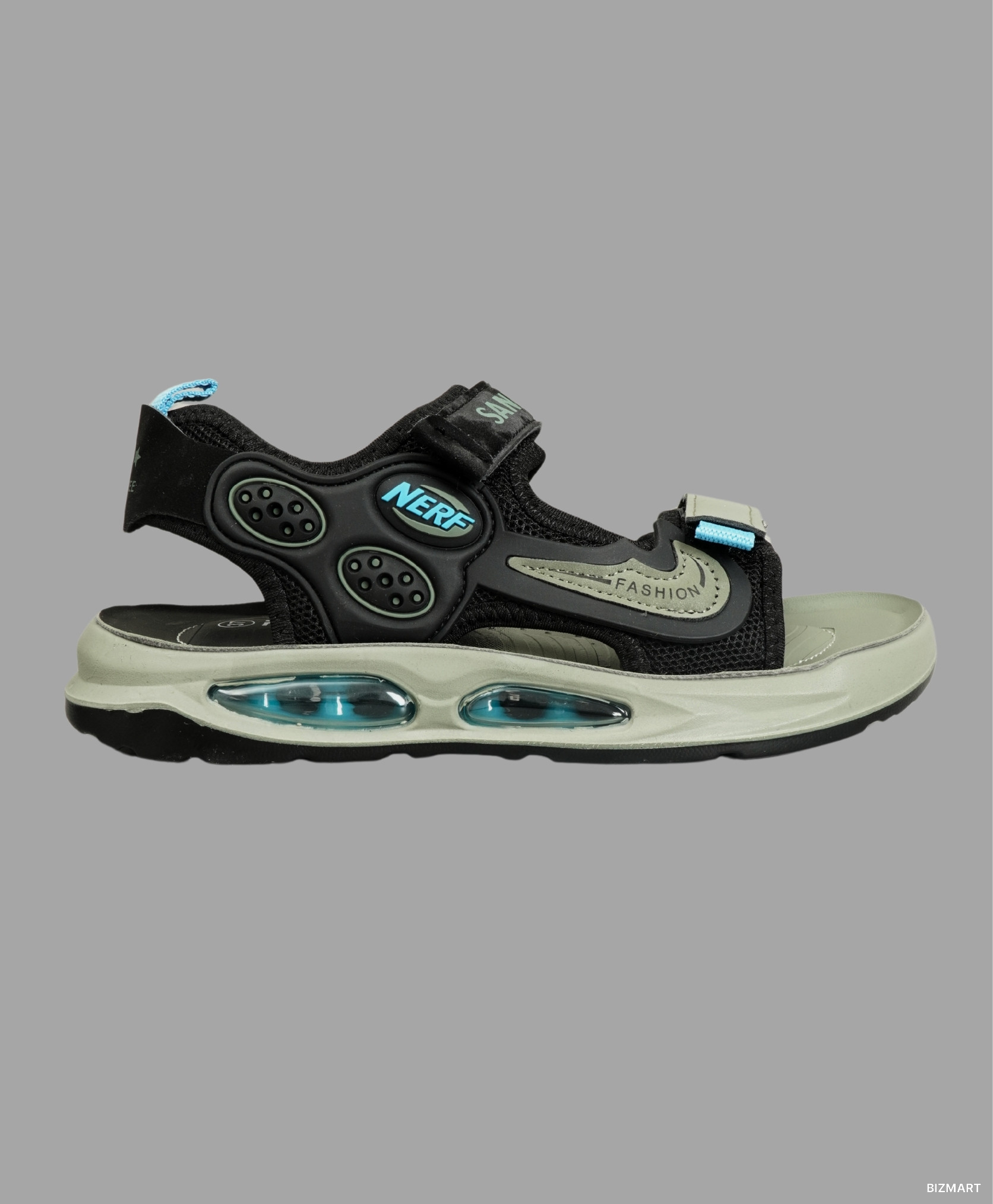 Стильные чёрно-зелёные сандалии с голубыми вставками — идеальный выбор для активных и модных людей. Сочетание чёрного и зелёного цветов с яркими голубыми акцентами придаёт обуви современный и динамичный вид, который легко сочетать с различными летними нарядами.