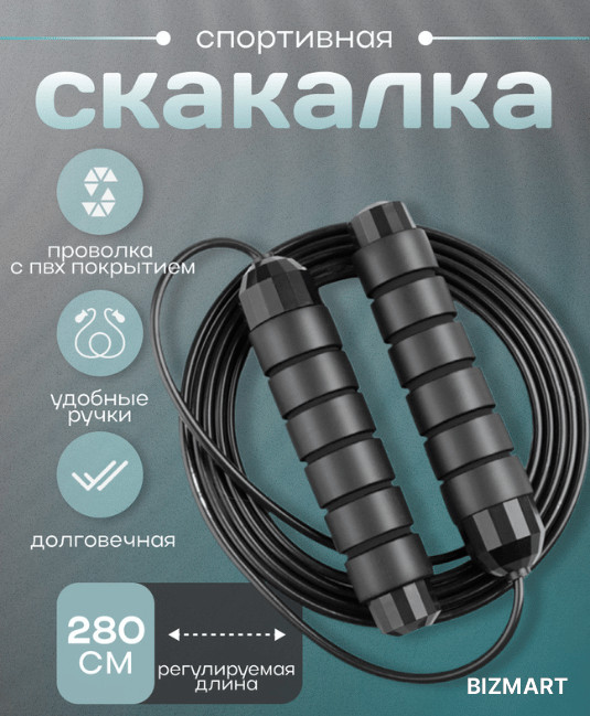 Спортивная скакалка длиной 280 см с регулируемой длиной оснащена прочной проволокой с ПВХ-покрытием, что обеспечивает долговечность и устойчивость к износу. Удобные ручки с мягкими вставками гарантируют комфортный хват и предотвращают скольжение во время тренировок. Отлично подходит для кардионагрузок, кроссфита и повседневных фитнес-занятий.