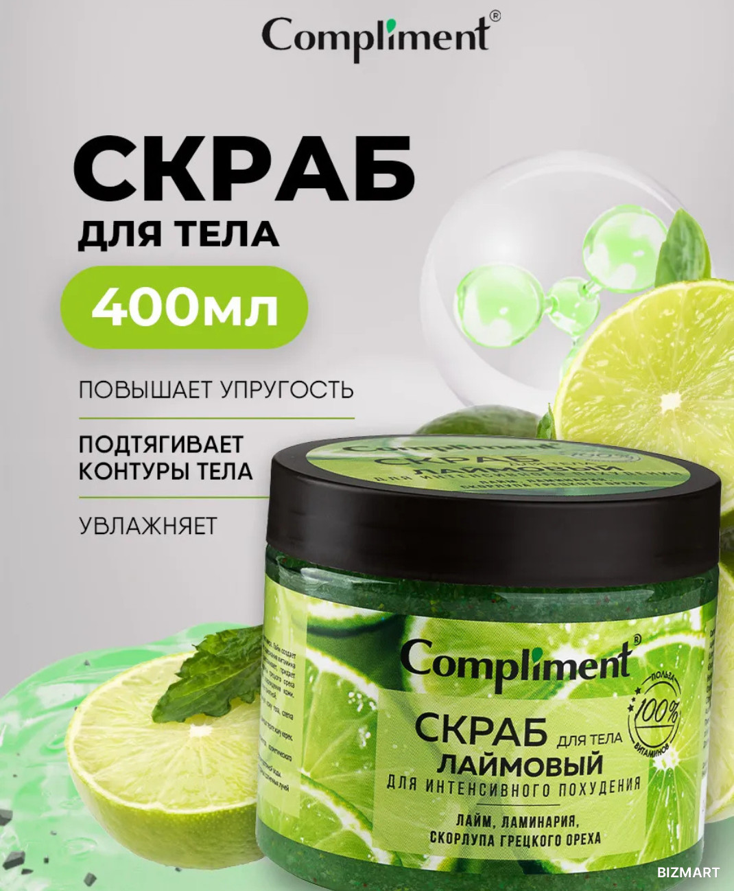 Скраб для тела Compliment превращает очищение кожи в роскошную и приятную процедуру. Микрогранулы полируют кожу, масла обеспечивает полноценное питание, смягчение и увлажнение, возвращая коже здоровое сияние. Скраб оказывает массажный эффект, способствуя обновлению и выравниванию рельефа кожи, делая ее более гладкой, подтянутой и упругой.После применения скраба кожа обновляется, обогащается витаминами и ценными питательными элементами, становится гладкой, подтянутой и упругой, выравнивается структура и повышается тонус.