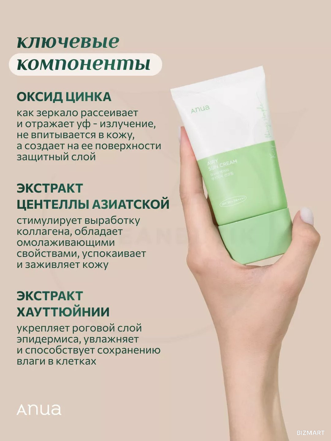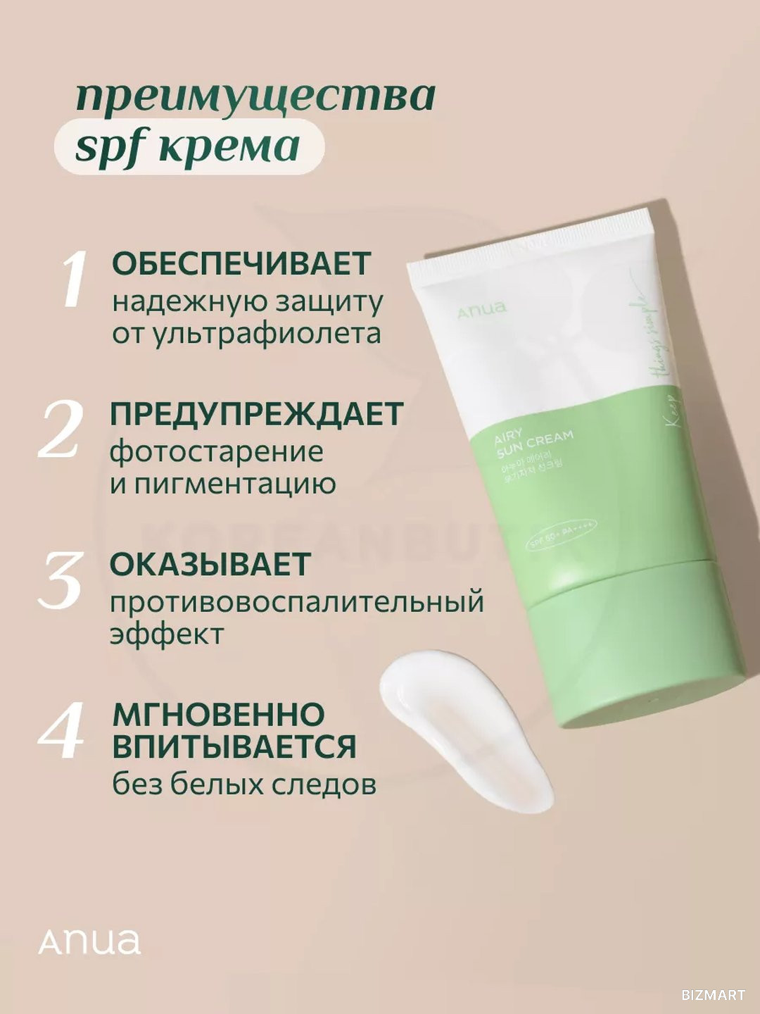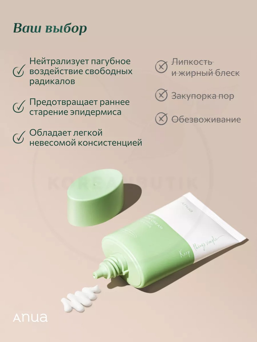 Успокаивающий солнцезащитный крем для лица ануа Anua Heartleaf Silky Moisture Sun Cream SPF 50+ PA++++ 50 мл на химических фильтров нового поколения защищает кожу от пагубных воздействий солнечных лучей, оказывает комплексное воздействие на чувствительную и склонную к воспалениям кожу. Органический спф восстанавливающий солнцезащитный крем оказывает успокаивающее и увлажняющее действие на кожу благодаря таким ингредиентам, как экстракт хауттюйнии сердцевидной и пантенол. Обладая эффектом контроля кожного себума, формула хорошо ложится под основу и продлевает стойкость макияжа. Увлажняющий крем гель корея подходит для проблемной, чувствительной, сухой и комбинированной кожи. Питательный легкий крем дневной с гиалуроном. Особенности защитный санскрин korea: эффективно защищает кожу от воздействия ультрафиолета; оказывает успокаивающее действие; препятствует раздражениям и покраснений; способствует себорегуляции; предотвращает появлению жирного блеска; уход от морщин; оказывает увлажнение; против пигментации, пигментных пятен и фотостарения кожи.