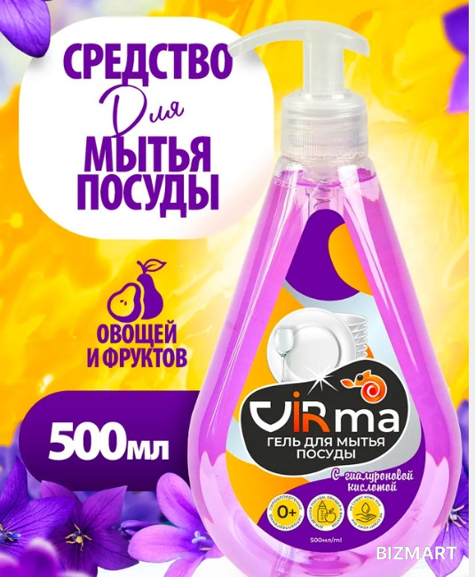 Гель для мытья посуды 500 мл VIRma с дозатором - это гипоаллергенное моющее средство, полностью смываемое водой с поверхности. Экологичный гель с нейтральным ph применяют для мытья детской посуды, игрушек 0+, для мытья овощей и фруктов. Гиалуроновая кислота в составе концентрата ухаживает за кожей ваших рук, оставляя их мягкими и увлажненными. Универсальное и эффективное средство с запахом полевых цветов быстро устраняет неприятные запахи и делает мытье посуды более комфортным. Всего несколько капель превращаются в густую пену, которая супер эффективно удаляет самые сильные и стойкие загрязнения не только со столовых приборов, но и с кухонного оборудования, даже гриля и барбекю. растворяет жировые загрязнения, как в горячей, так и в холодной воде, а гиалурон ухаживает за кожей, предотвращая от потрескивания и сухости. Моющее средство для посуды полностью биоразлагаемо, безопасно для септиков и окружающей среды. По своим свойствам не уступает корейским моющим средствам, при этом разработан в России. Имеет международный экологический сертификат Ecolabel.
