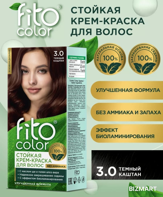 Стойкая крем-краска Fito color — природная красота для Ваших волос! Единственная крем-краска для волос, разработанная на основе натуральных природных компонентов! Нежная кремовая текстура краски, обволакивая каждый волос, глубоко проникает в его структуру и окрашивает в сочные, объёмные, яркие, цвета. Крем-краска идеально закрашивает седину! Входящие в состав натуральные масла и экстракты растений питают, укрепляют и восстанавливают волосы, придают им гладкость, эластичность и объём.