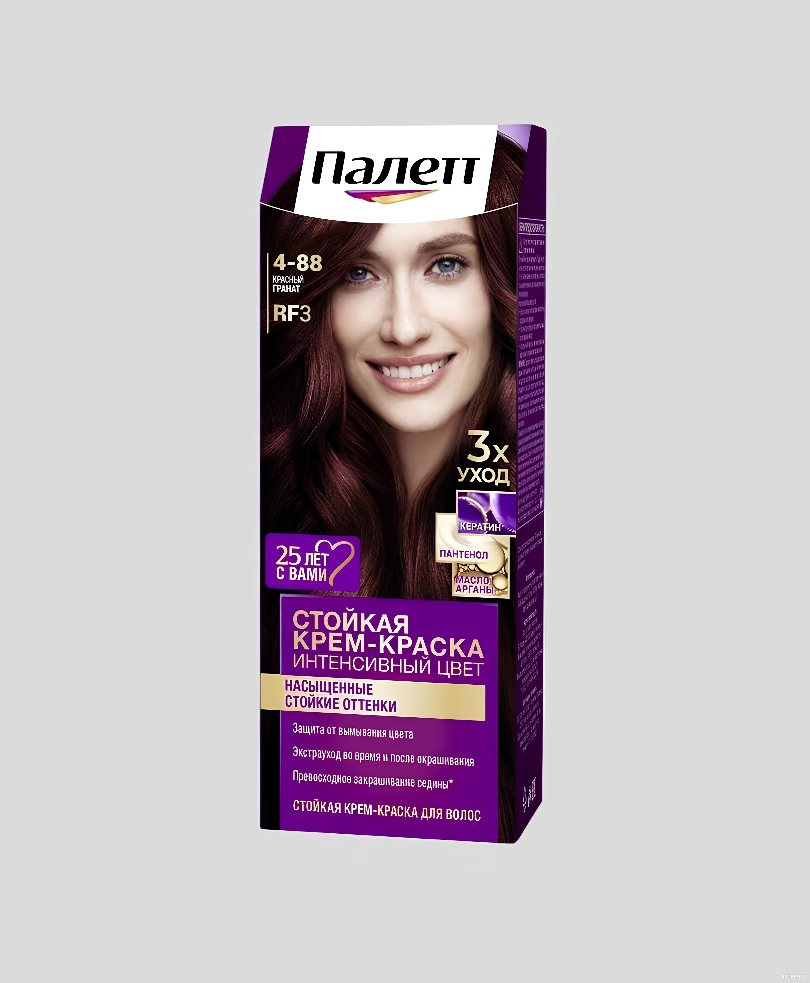 Стойкая крем-краска для волос Palette RF3 (4-88) Красный гранат — это идеальный выбор для тех, кто хочет придать своим волосам насыщенный, глубокий и яркий цвет. Этот оттенок "Красный гранат" сочетает в себе богатые красные и бордовые нотки, которые придают волосам удивительный блеск и изысканную яркость. Крем-краска с аммиаком легко наносится и обеспечивает равномерное окрашивание, которое держится долго, не тускнеет и не вымывается с течением времени.
