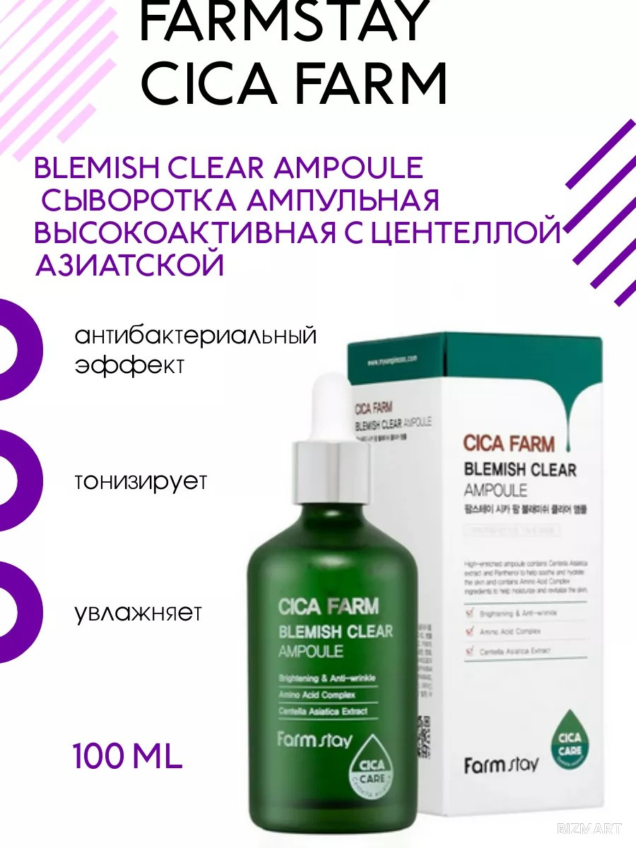 Сыворотка с центеллой Cica Farm Blemish Clear Ampoule (100 мл) – высокоактивная ампульная сыворотка для восстановления кожи и борьбы с несовершенствами. Разработана с использованием центеллы азиатской, она эффективно успокаивает, увлажняет и восстанавливает кожу, подходя для всех типов, особенно для чувствительной и раздраженной.