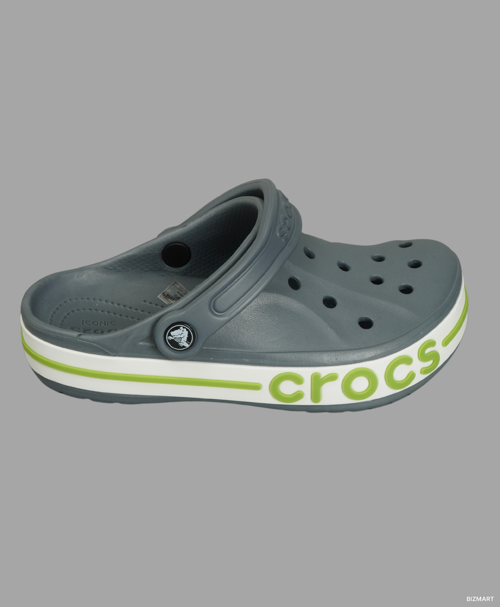 Легкие сабо Crocs серого цвета с лимонно-зеленой полосой