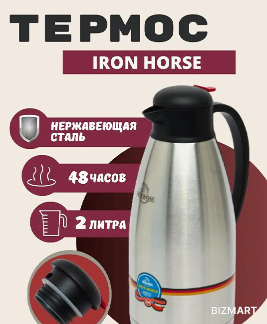 Просто сполосните его горячей водой перед использованием, чтобы обеспечить длительное сохранение тепла. Стильный термос-чайник IRON HORSE очень нужный и удобный в поездках, выездах на природу, дачу или на пикники. Термос IRON HORSE выполнен из качественной нержавеющей стали, которая не вступает в реакцию с содержимым термоса и не изменяет вкусовых качеств напитка. Двойная стенка из нержавеющей стали сохраняет температуру на более длительный срок. Вакуумный закручивающийся клапан предохраняет от проливаний, а удобная кнопка-дозатор избавит от необходимости каждый раз откручивать крышку. Данная модель термоса прочная, долговечная и в тоже время легкая. Стильный металлический термос понравится абсолютно всем и впишется в любой интерьер кухни. Легко и просто моется. Термос используется для заваривания любых напитков и позволяет сохранять температуру горячего до 12 часов, а теплого до 24 часов.