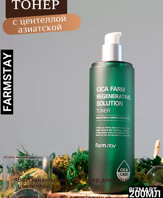 Тоник для лица FarmStay Cica Farm Regenerating Solution Toner с центеллой азиатской (200 мл) – восстанавливающий и успокаивающий тонер для всех типов кожи. Создан с использованием мощных натуральных ингредиентов, включая центеллу азиатскую, этот тонер эффективно восстанавливает, увлажняет и успокаивает кожу, уменьшая воспаления и покраснения.