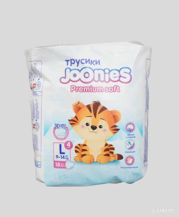 Трусики Joonies Premium Soft — это идеальный выбор для малышей весом от 9 до 14 кг. Обеспечивают нежную заботу и надёжную защиту благодаря технологии 3D AbsorTech, мягким материалам и гипоаллергенному составу.