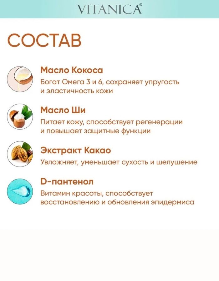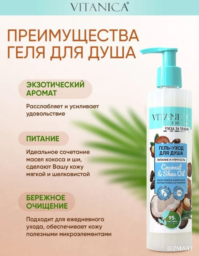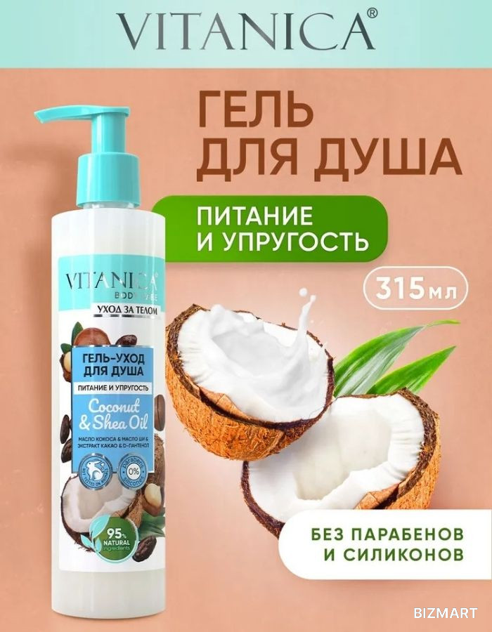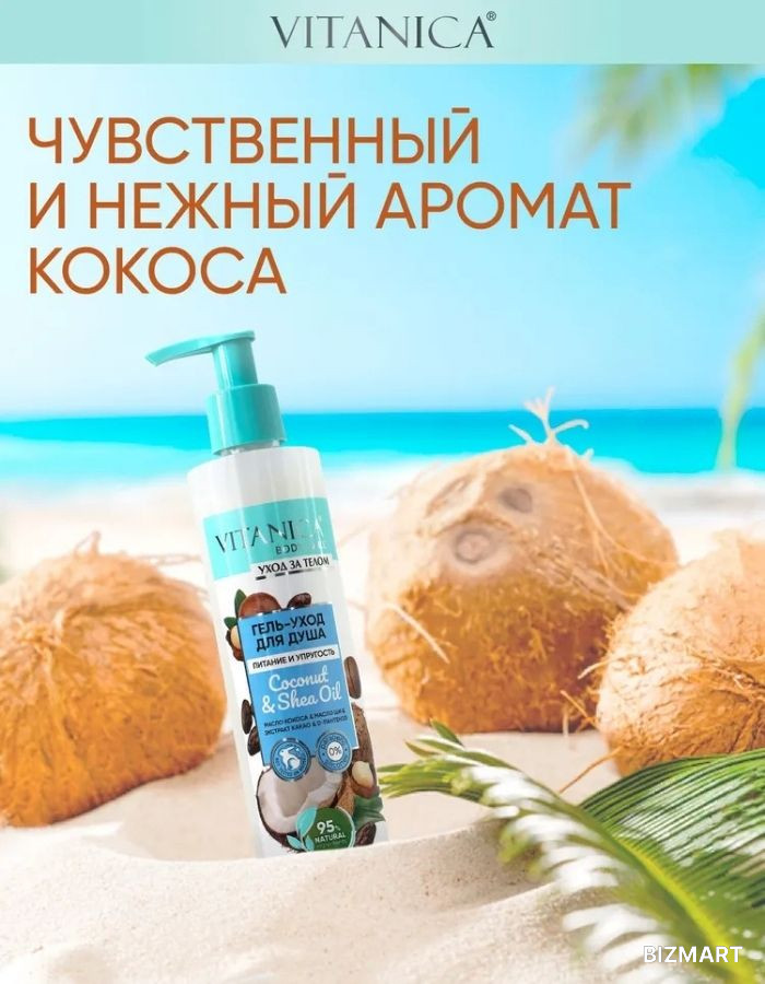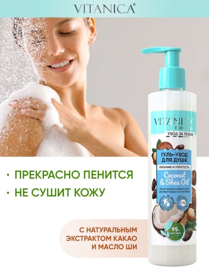 Почувствуйте настоящее тайское наслаждение с гелем для душа Vitanica - экзотический аромат кокоса расслабит и усилит удовольствие от принятия душа, а идеальное сочетание масел: кокоса и ши, сделают Вашу кожу мягкой, упругой и шелковистой. Благодаря высококачественным полезным компонентам натурального происхождения, гель наилучшим образом влияет на кожу, обеспечивает бережное очищение и насыщает кожу полезными микроэлементами. Отлично подходит для всех типов кожи и ежедневного применения.