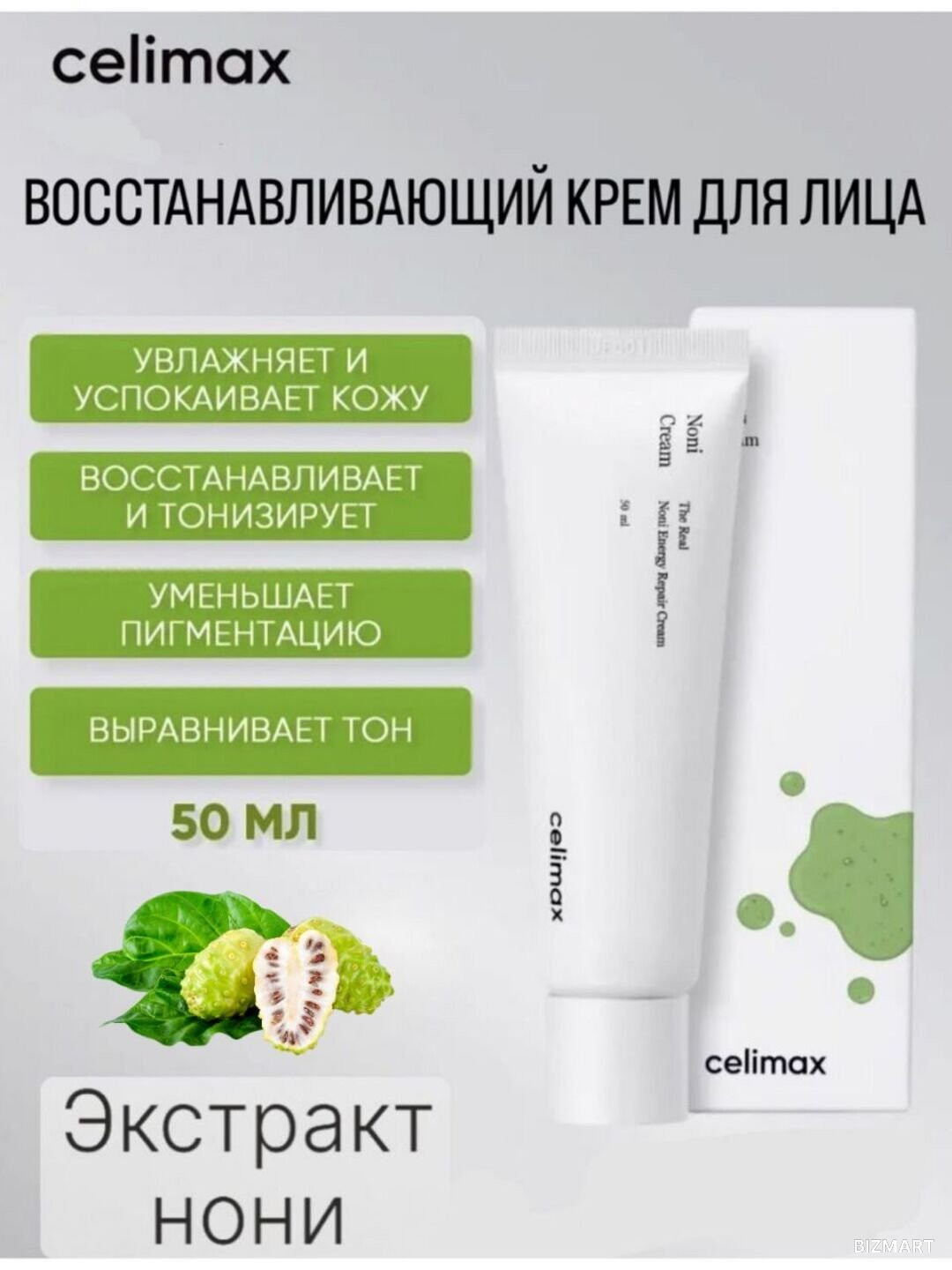 Восстанавливающий крем для лица Celimax The Real Noni Energy Repair Cream объемом 50 мл — это продукт, специально разработанный для ухода за проблемной кожей. Он содержит 57% экстракта нони, известного своими успокаивающими и питательными свойствами. Крем эффективно устраняет шелушение, сухость, воспаления и повышает упругость кожи