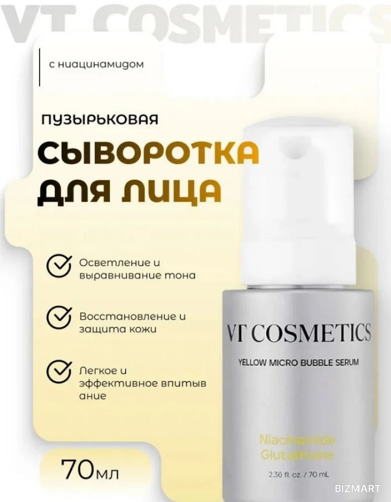 Пузырьковая сыворотка VT Cosmetics Niacinamide Glutathione Yellow Micro Bubble Serum осветляет постакне и пигментные пятна, выравнивает тон и борется с тусклостью, возвращает лицу здоровое сияние.