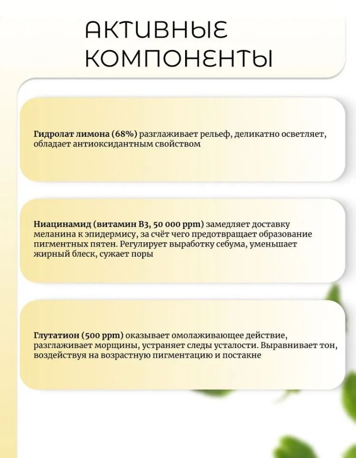 Гидролат лимона (68%) разглаживает рельеф, деликатно осветляет, обладает антиоксидантным свойством.