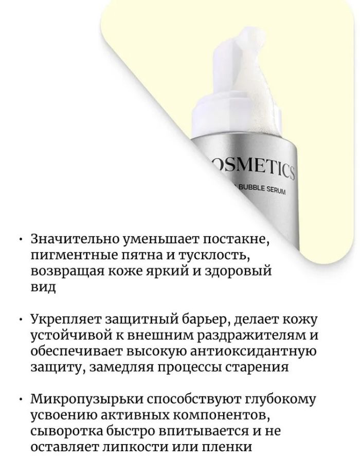 Микропузырьки способствуют глубокому проникновению и усвоению активных компонентов. Сыворотка быстро впитывается не оставляя липкости и плёнки.
