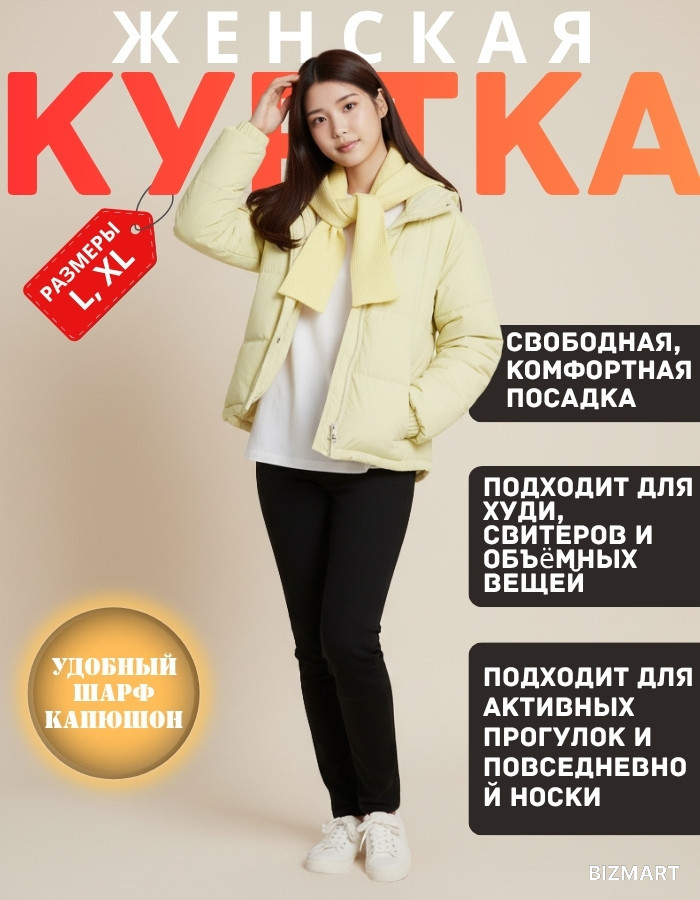 Удобная и тёплая женская куртка классического силуэта — отличный вариант для повседневной носки в холодное время года. Модель выполнена без оверсайз-посадки, благодаря чему аккуратно подчёркивает фигуру и обеспечивает комфортную посадку. В комплект входит функциональный шарф-капюшон, который можно носить как отдельный аксессуар или использовать для защиты от ветра и холода.