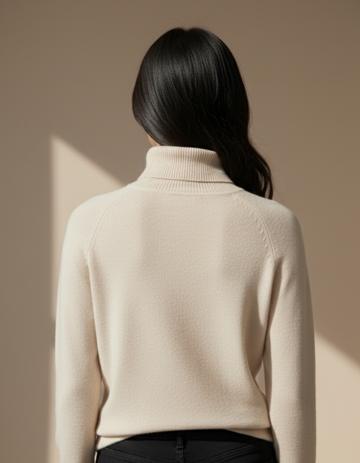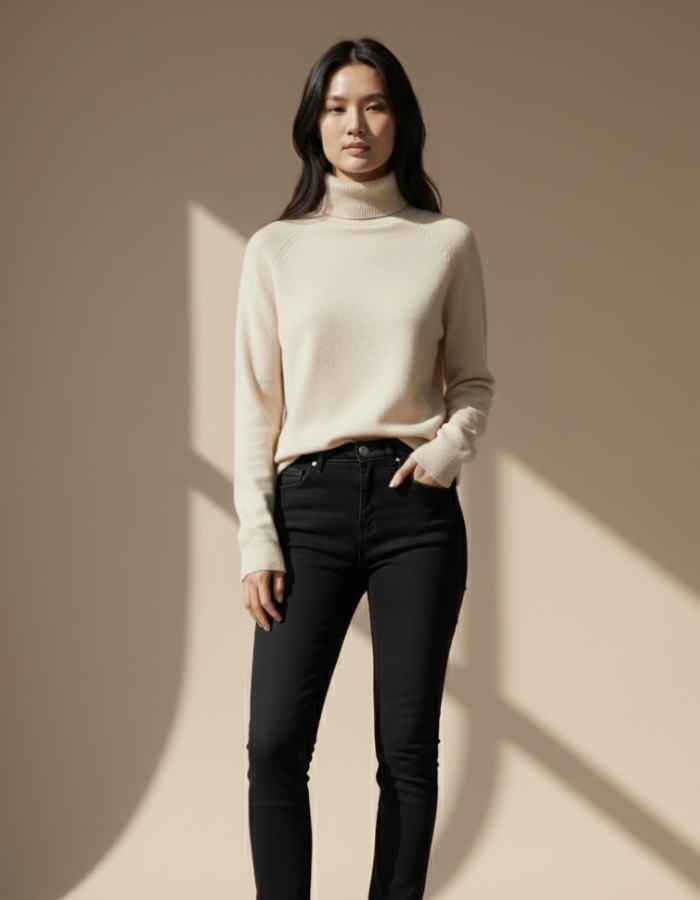 Мягкая и комфортная водолазка из трикотажа с высоким воротником. Эластичная и приятная к телу ткань обеспечивает уют и свободу движений. Нежный бежевый оттенок подчёркивает естественность и изысканность образа. Универсальная модель, идеально подходящая для офиса, прогулок и повседневных луков, легко комбинируется с брюками, юбками и джинсами.