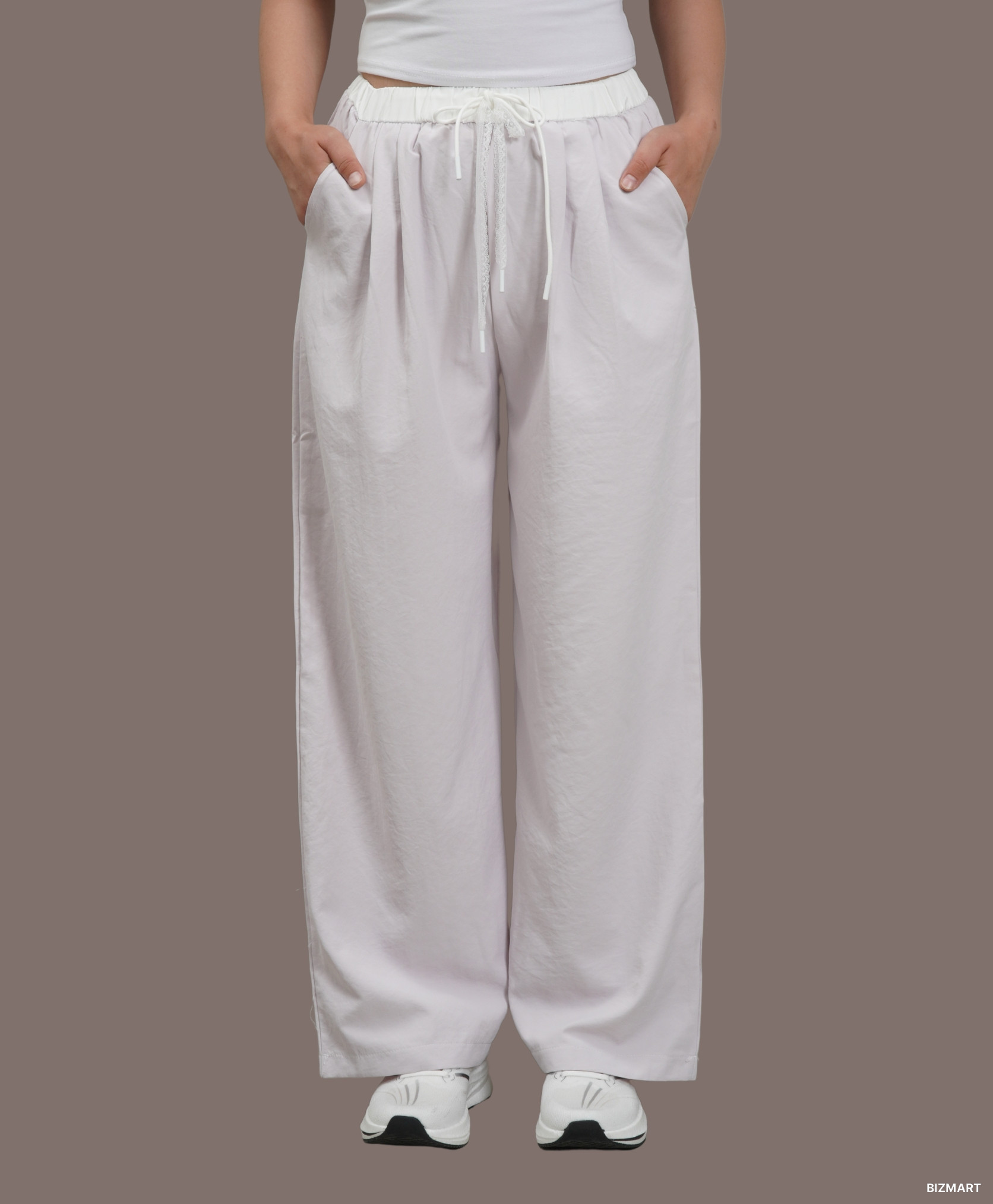 Женские белые брюки — элегантность и свежесть в каждом образе. Белые брюки — идеальный выбор для тёплого сезона и стильных повседневных или деловых образов. Светлый оттенок освежает, подчёркивает загар и придаёт образу лёгкость. Модель выполнена из качественного материала, приятного к телу и комфортного в носке. Стильная одежда с высокой посадкой на удобной широкой резинке с завязками - хит этого года. Штаны спортивные подчёркивают все достоинства женской фигуры и скрывают её недостатки.