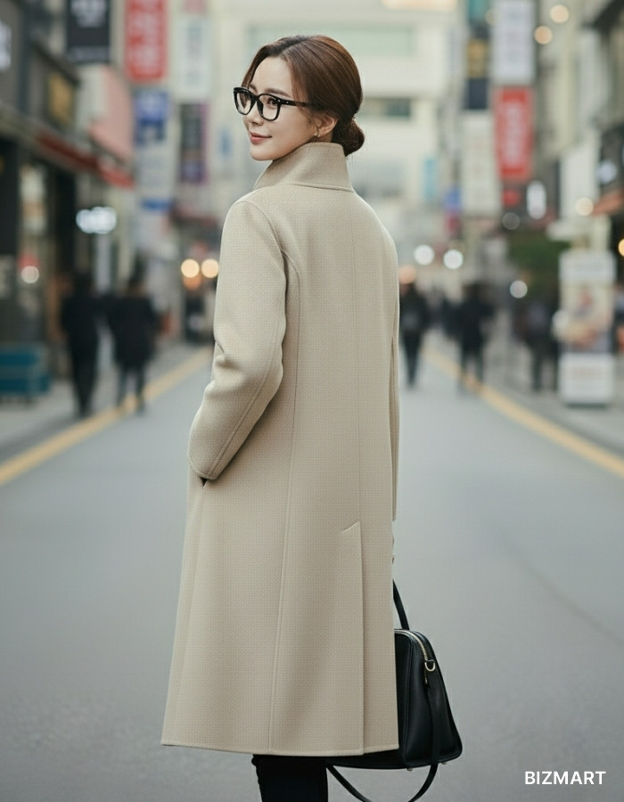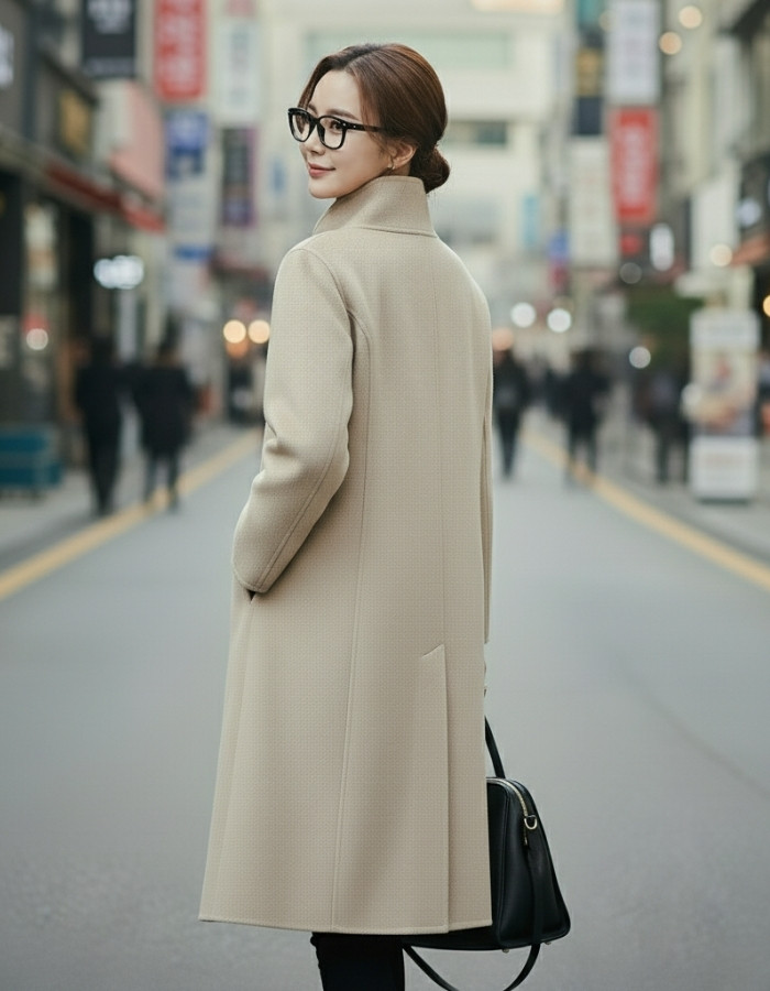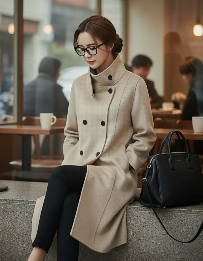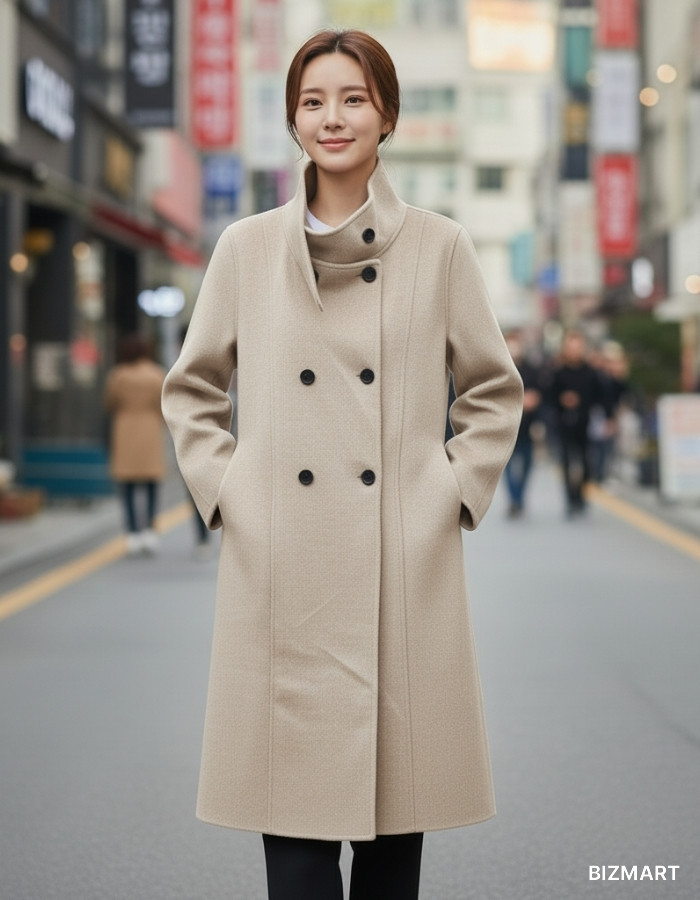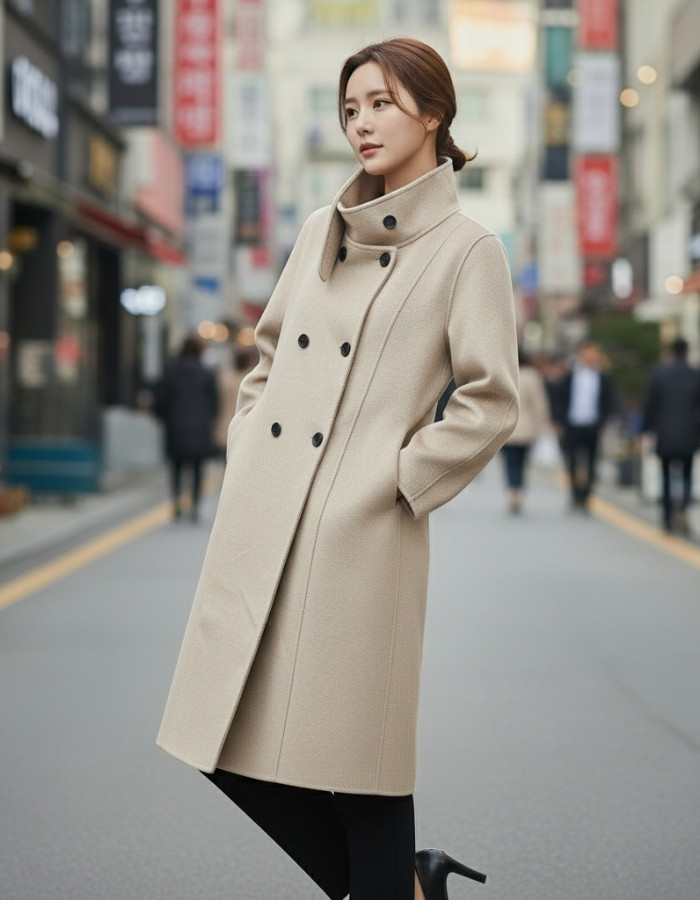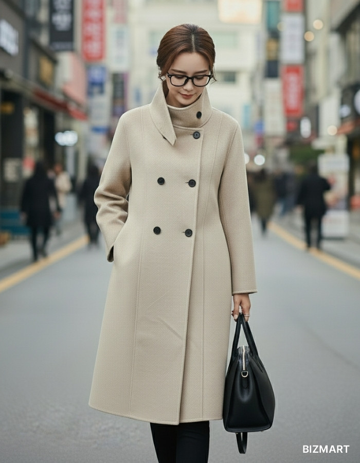 Модель украшена акцентными пуговицами на груди что придаёт образу утончённость и делает пальто визуально более дорогим. Плотная ткань хорошо держит форму, защищает от ветра и сохраняет тепло, а мягкий отложной воротник добавляет женственности.
