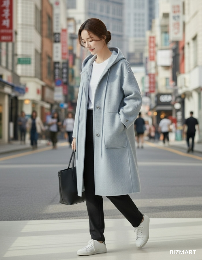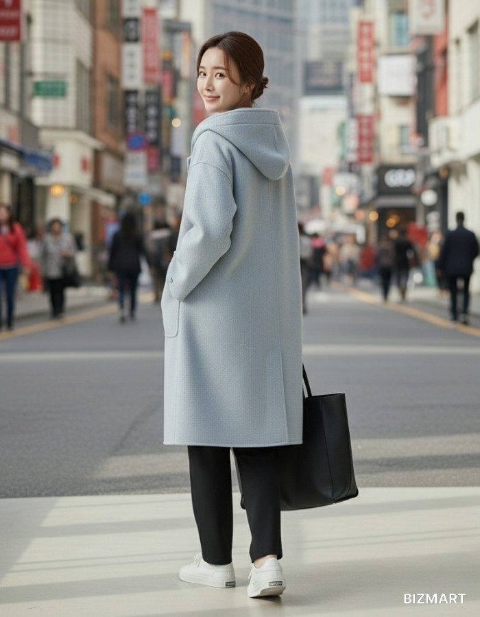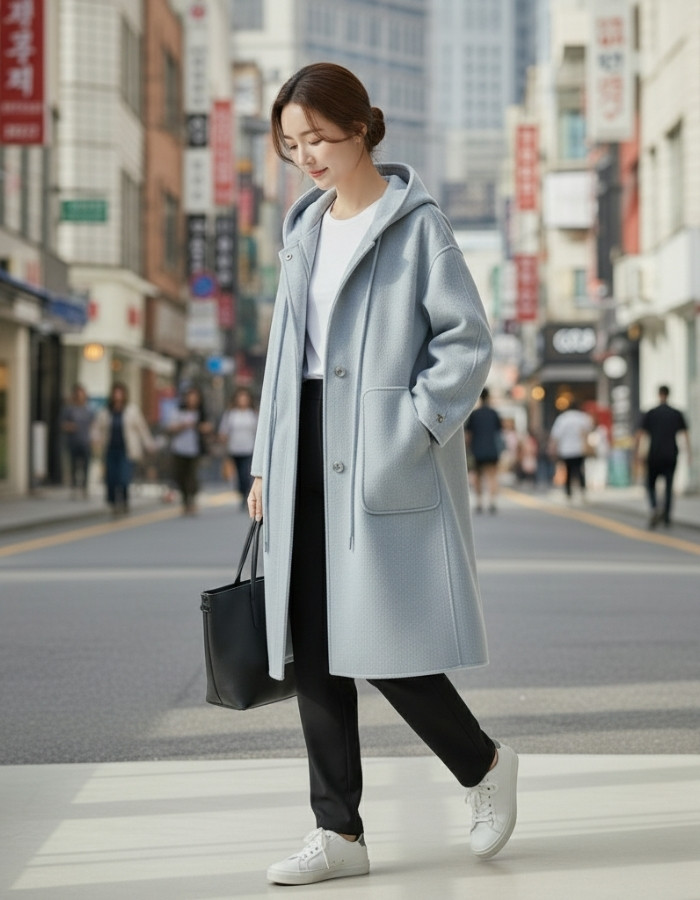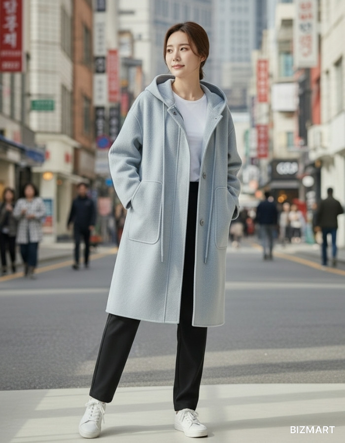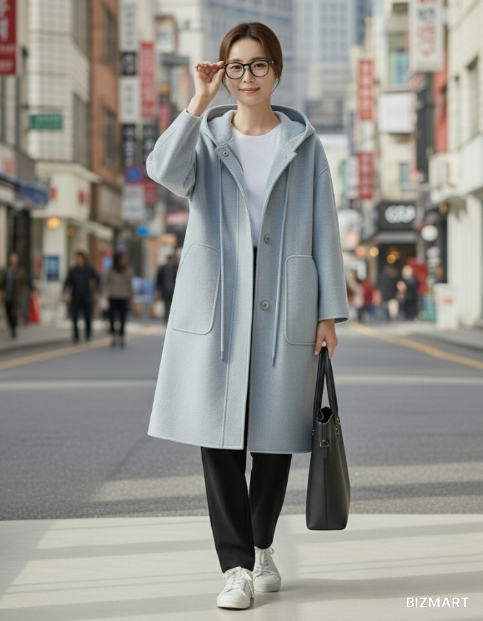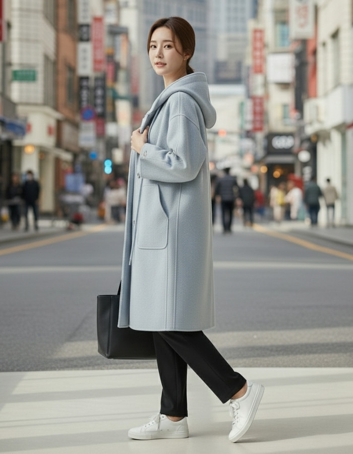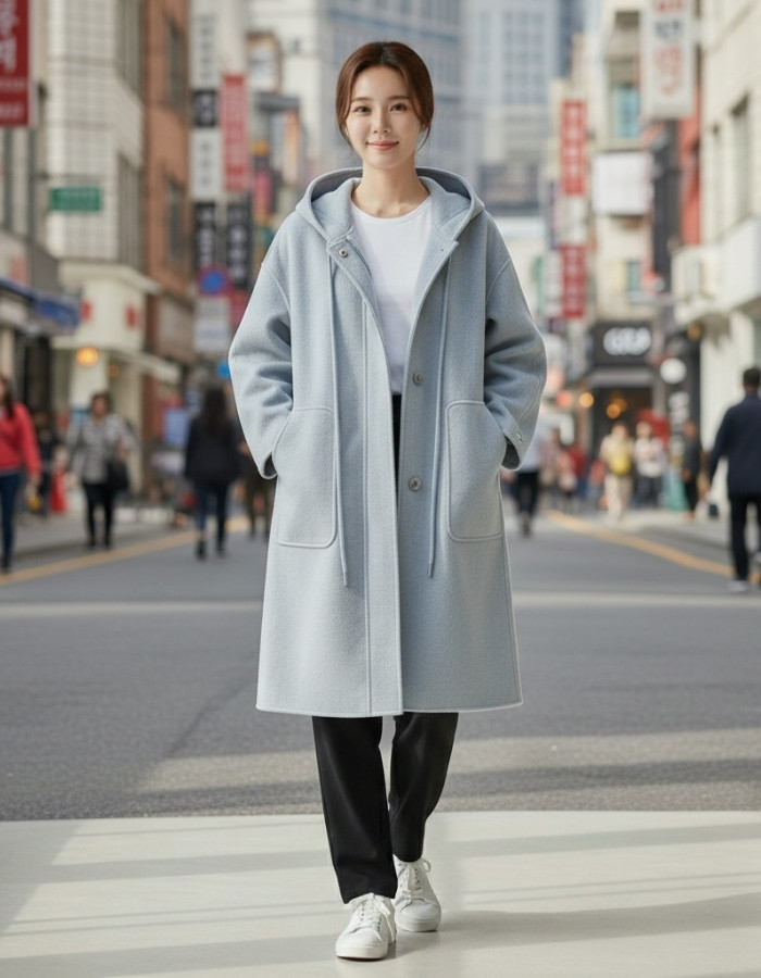 Модель украшена акцентными пуговицами на груди и декоративными хлястиками на карманах, что придаёт образу утончённость и делает пальто визуально более дорогим. Плотная ткань хорошо держит форму, защищает от ветра и сохраняет тепло, а мягкий отложной воротник добавляет женственности.